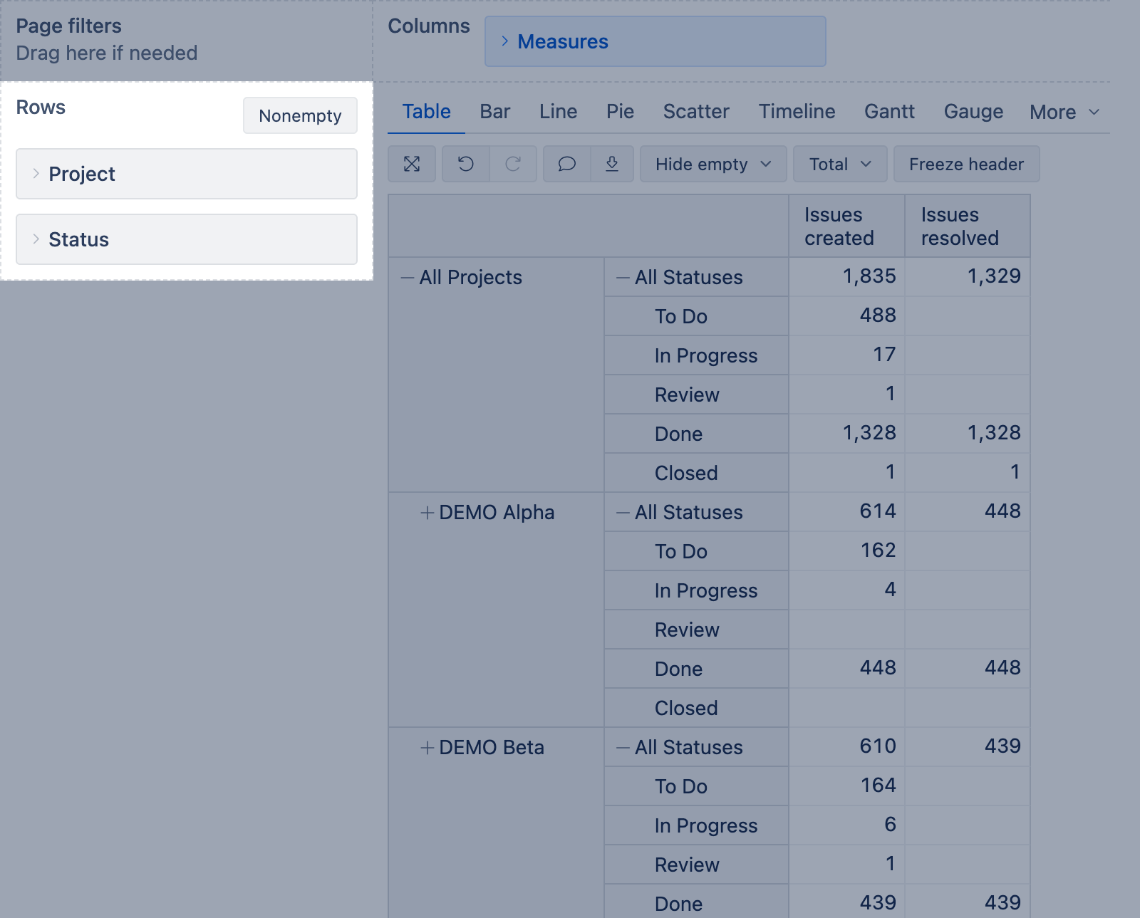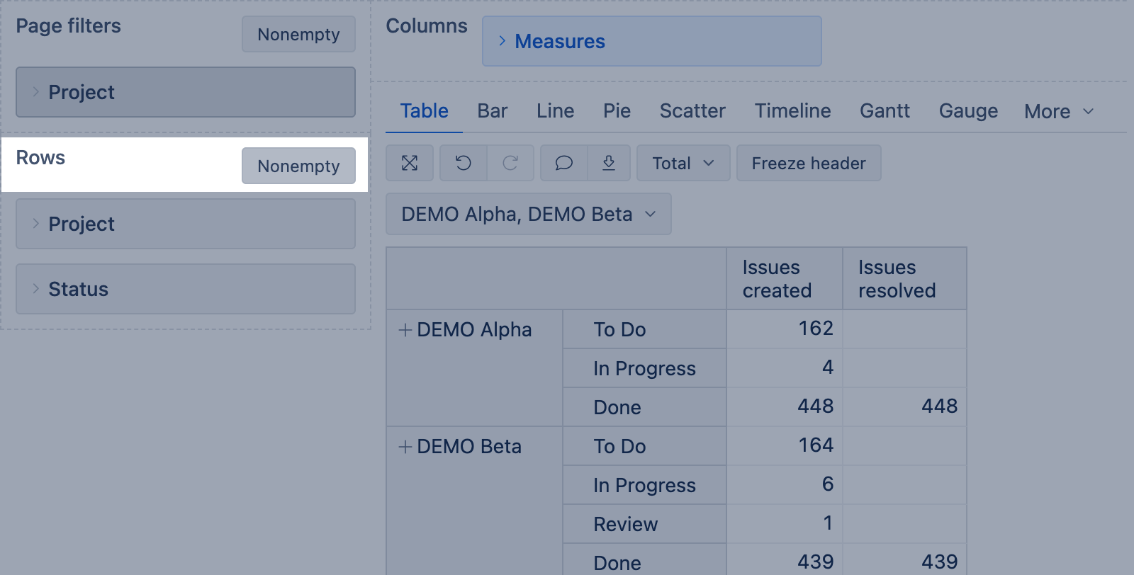 - when nonempty option is selected, then only rows (members or their combinations) having any measure, according to the Page selection, are retrieved. However, the nonempty option itself could work slow. You would like to use it only to significantly reduce the number of rows based on Page filters selection. eazyBI enables nonempty only for the dimension Issue on Rows by default.