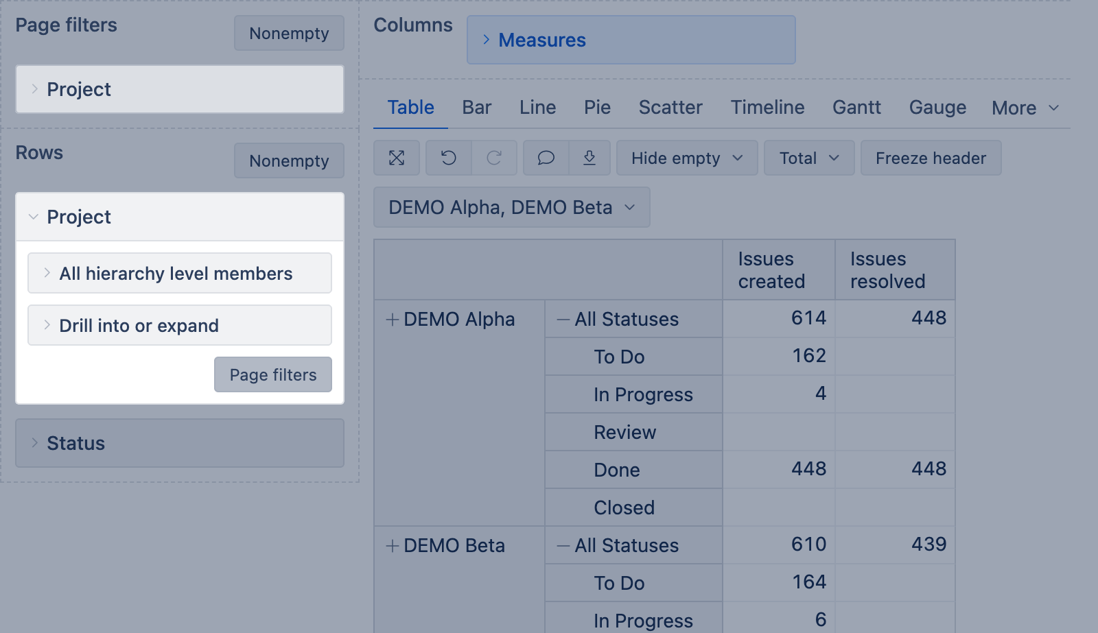 - Some dimensions contain the same data, for example, Project level in Issue, Fix version, Affects version dimensions contain all the projects as Project dimension; use, in Page filters, Project level of the same dimension as in Rows instead of Project dimension