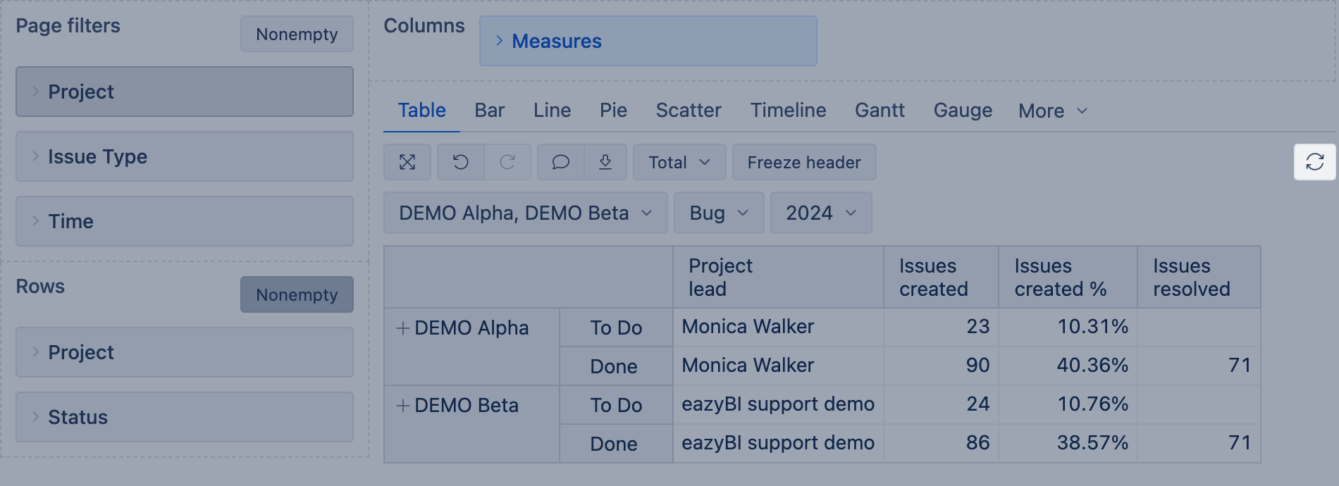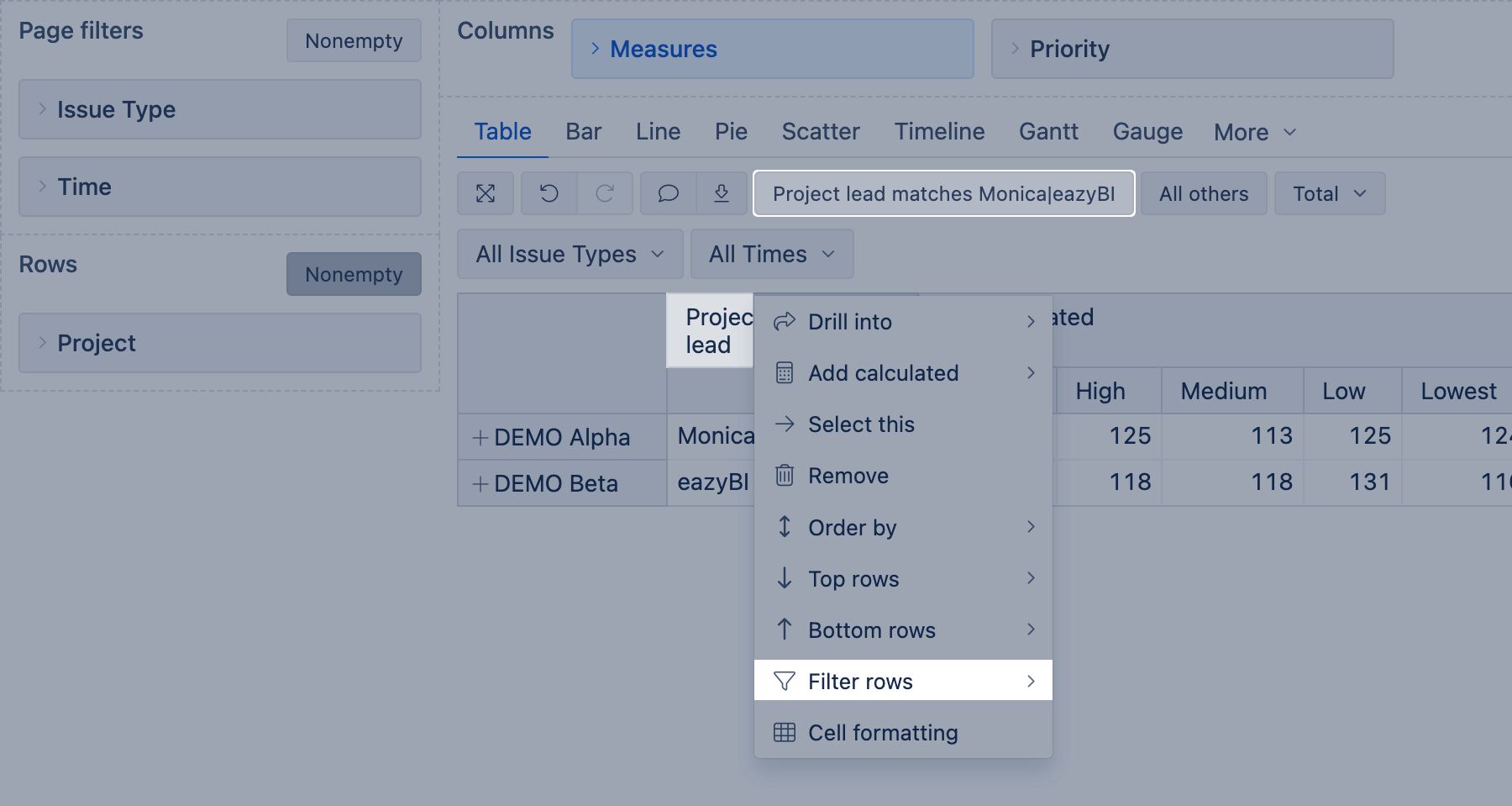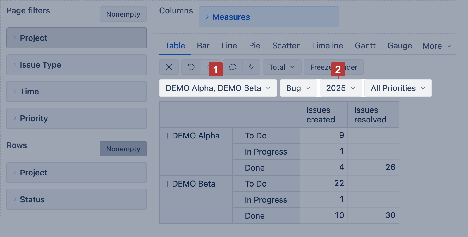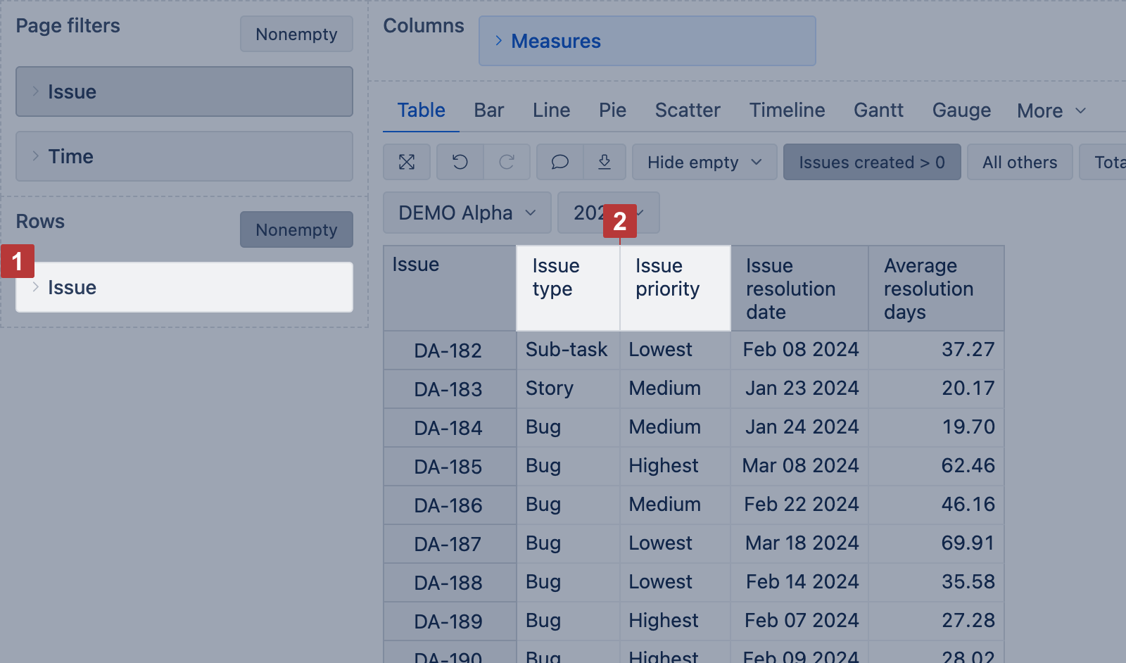 9. Filter rows by simple measures (Issues created, Issues resolved) and properties.
