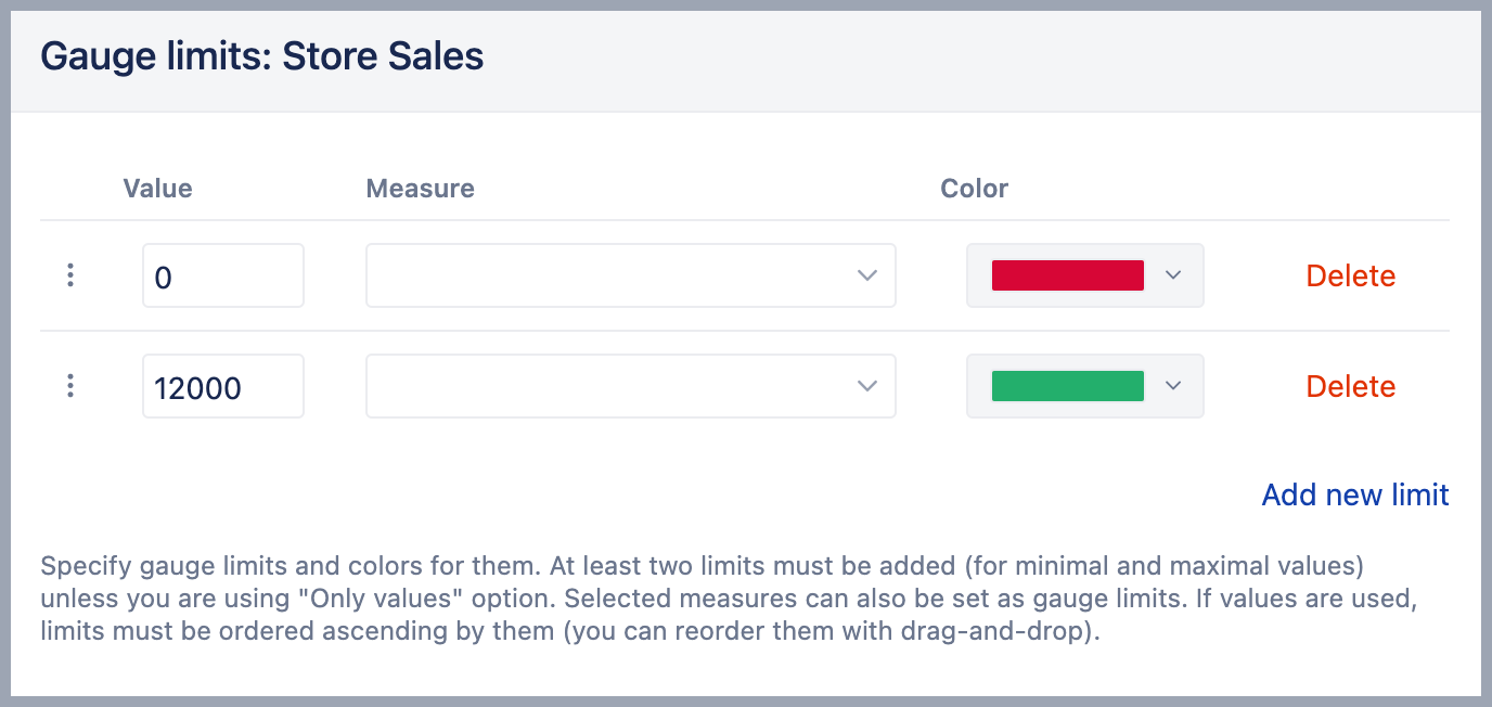 You can set a specific numerical Value or percentage as a limit for the gauge. In this case, you may use k suffix to enter thousands, M suffix to enter millions or % suffix to enter a percentage value. Or you can set another Measure as a limit. Note, this measure should be selected for the report as columns as well. To change the default color of Sparkline do not enter any value, but only change the Color of the limit.