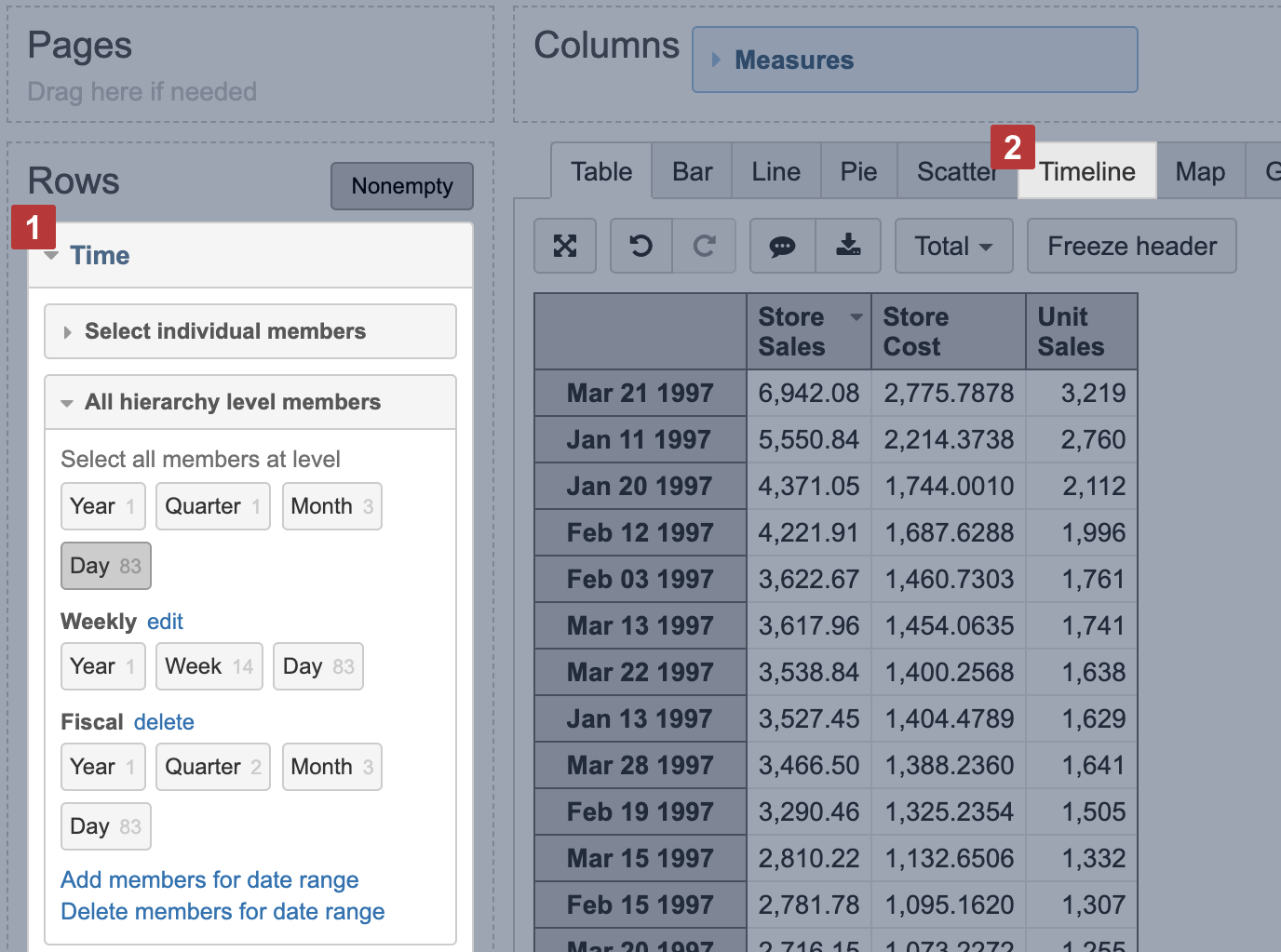 At first select Time dimension [1] with corresponding hierarchy level for data representation (years, quarters, months, weeks or days) on rows and necessary measures on columns. Then switch to Timeline [2] tab and change display options for measures (as lines, bars, areas, points, or vertical lines) if needed.
