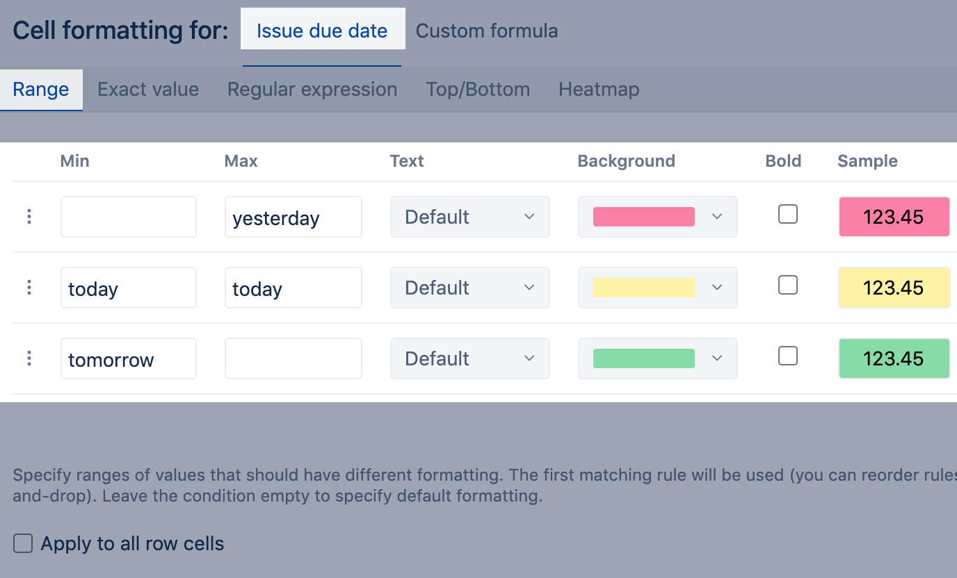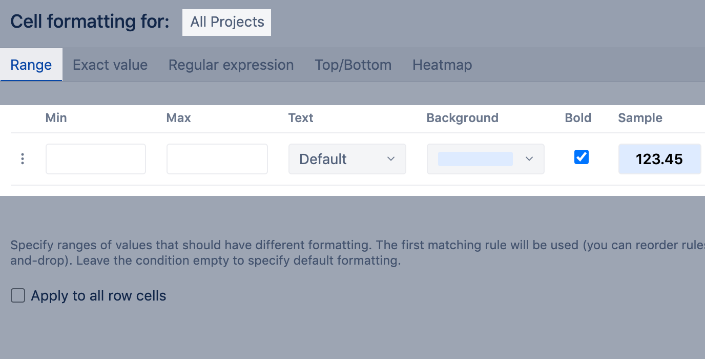 Specify ranges of values that should have different formatting. Can be used for numeric values, percentages, dates, or file sizes. Both min and max end-point values are included in the range.