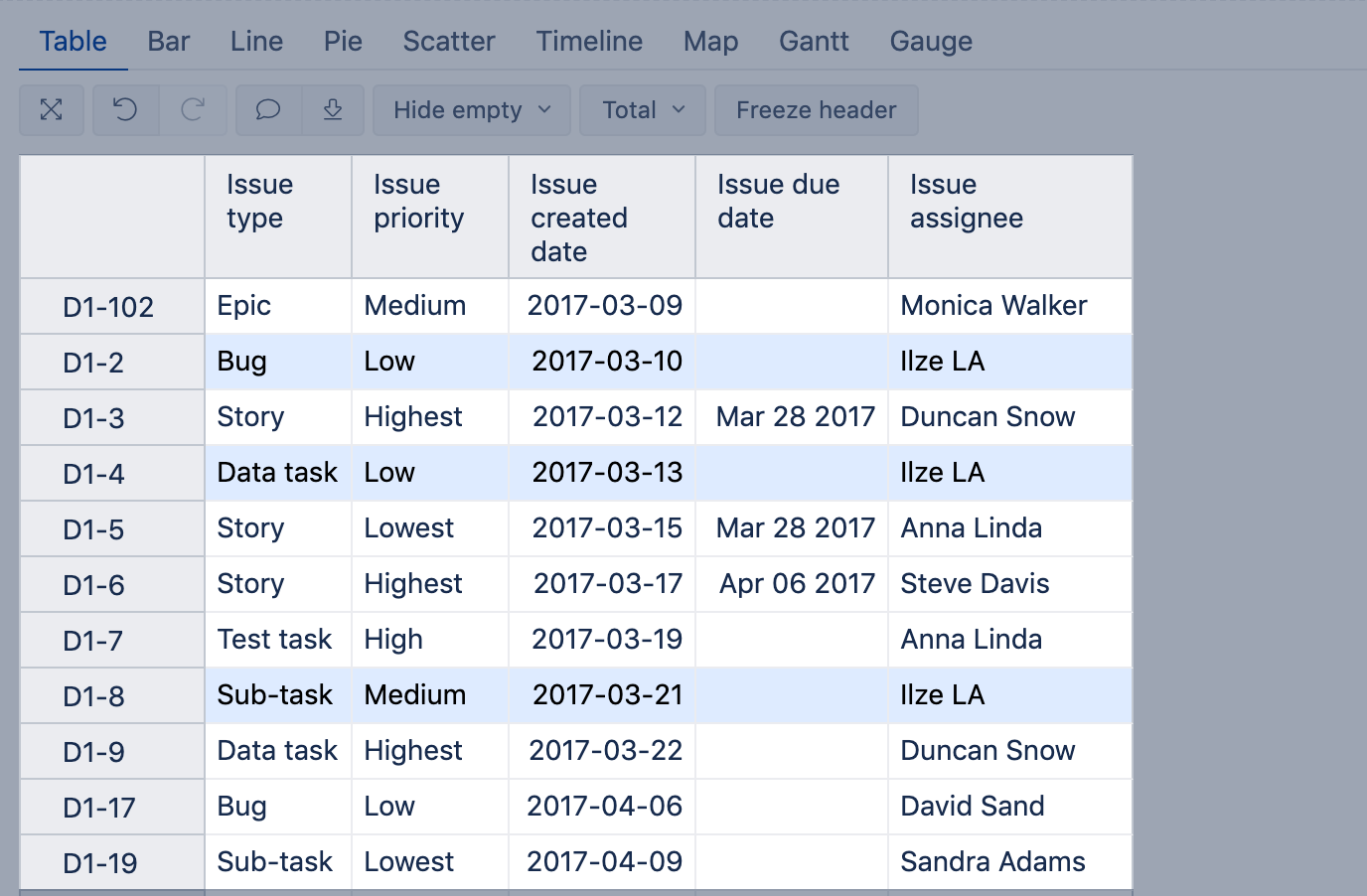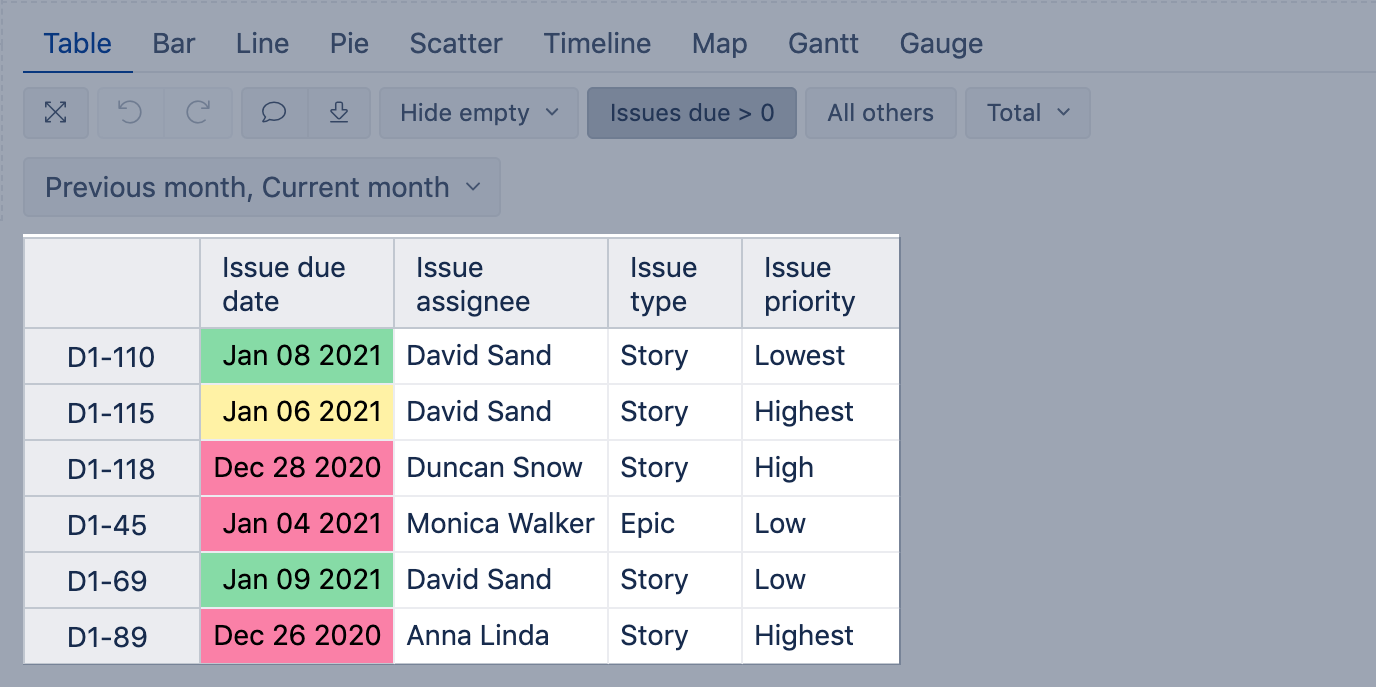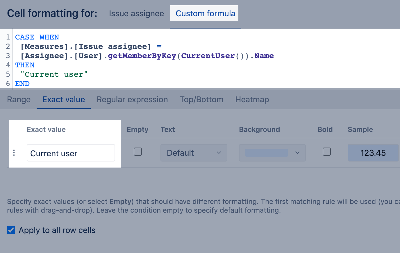 Color the background for issues assigned to me (i.e. the user who is currently logged into eazyBI). Set the condition on the Issue assignee column if present in the report or on any other text column. In the example, the conditional formatting is set on the Issue assignee column and applied to all row cells. The calculation formula returns the value "Current user" if the issue assignee is the current user; as "Current user" is a unique value, the exact value condition is used.