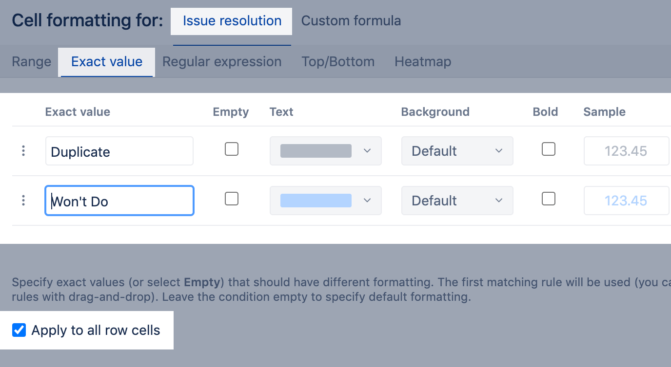Use exact value to apply rules for text or integer numerical values. This approach is recommended if you have a few specific or unique values (e.g., statuses for texts, story points for numbers) and you want to color-code cells by them. Use precise and case-sensitive values. Select the Empty checkbox to highlight cells with empty values.