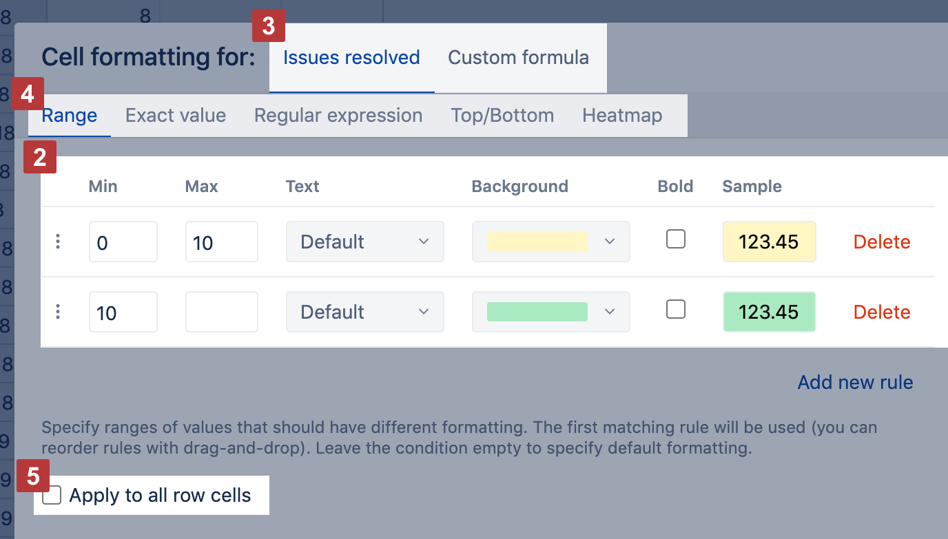 There are two ways how to apply those rules [3]: you can set them on the values displayed in the cells or on the value calculated by a custom formula. Also, there are several ways to define conditions [4]: Range, Exact value, Regular expression, Top/Bottom, and Heatmap. Select one of them.