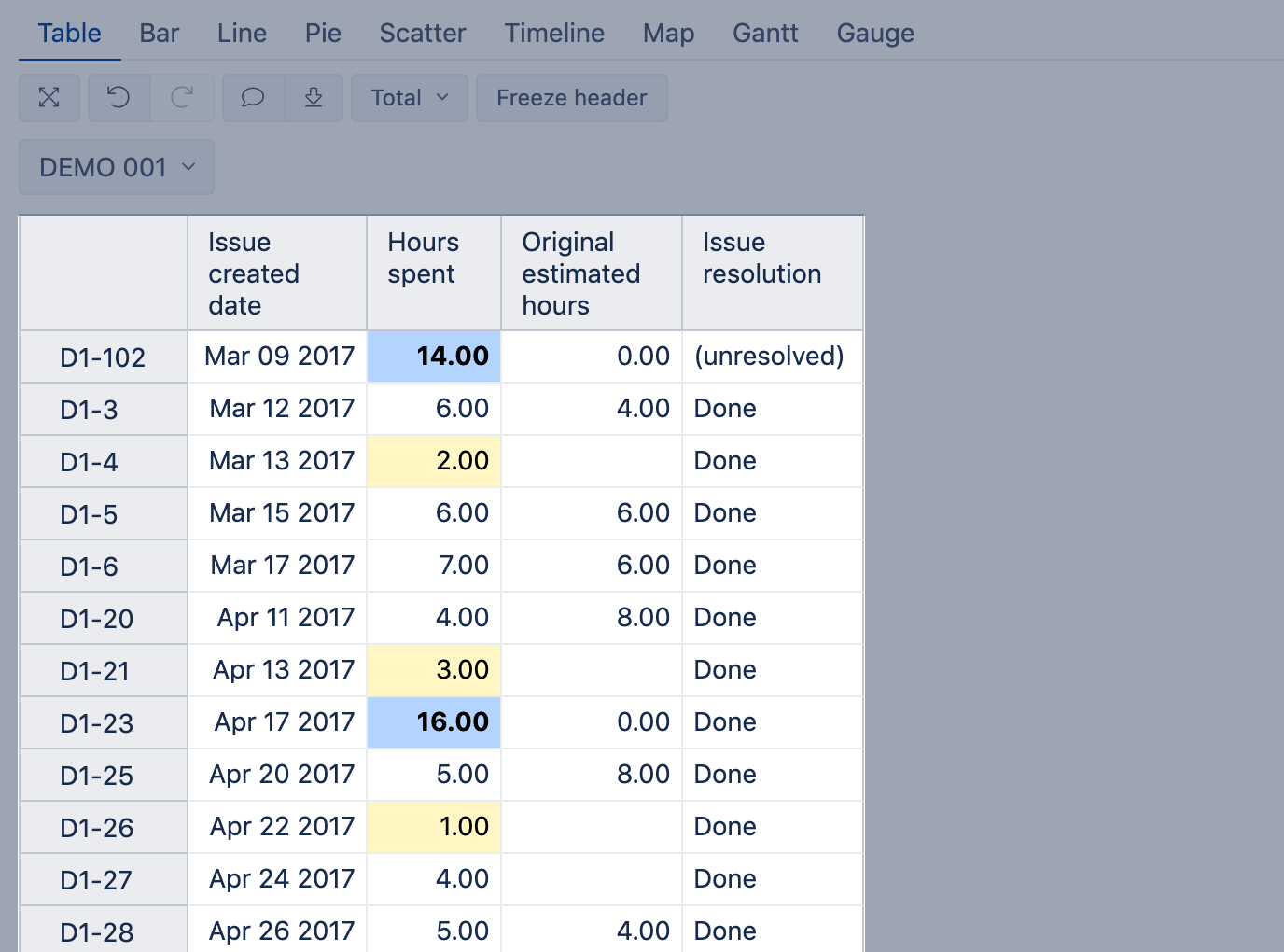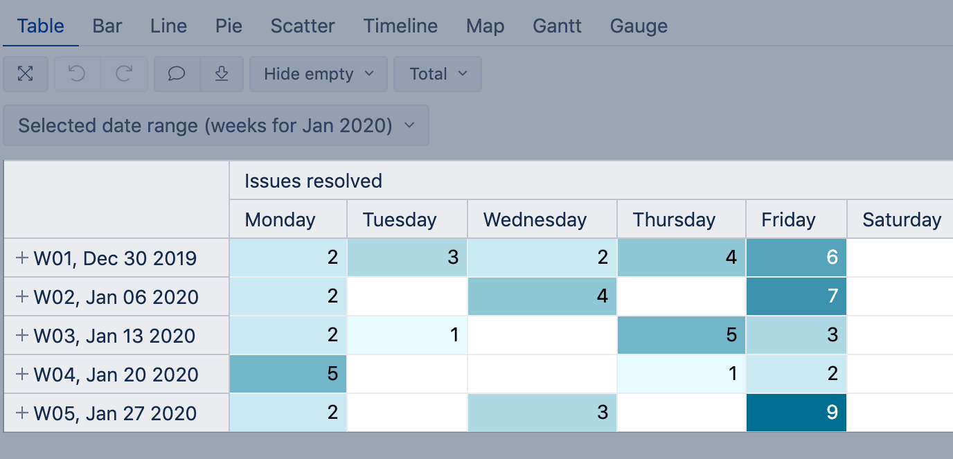 Color as a heatmap table with issues resolved where lighter color is for weekdays with fewer resolved issues and darker color - for cells with a larger number of resolved issues.