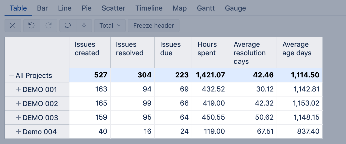 In the "All Projects" row, show all values on pale blue background with bold font.