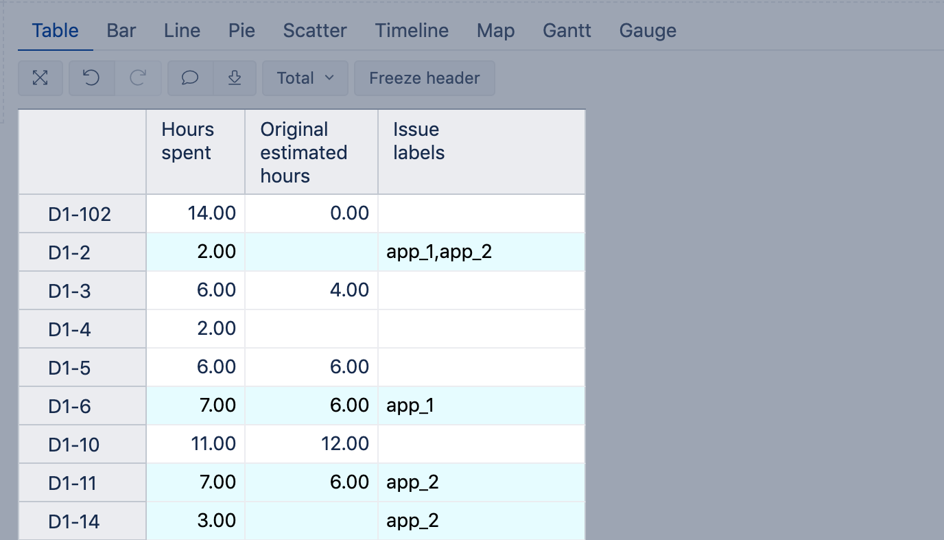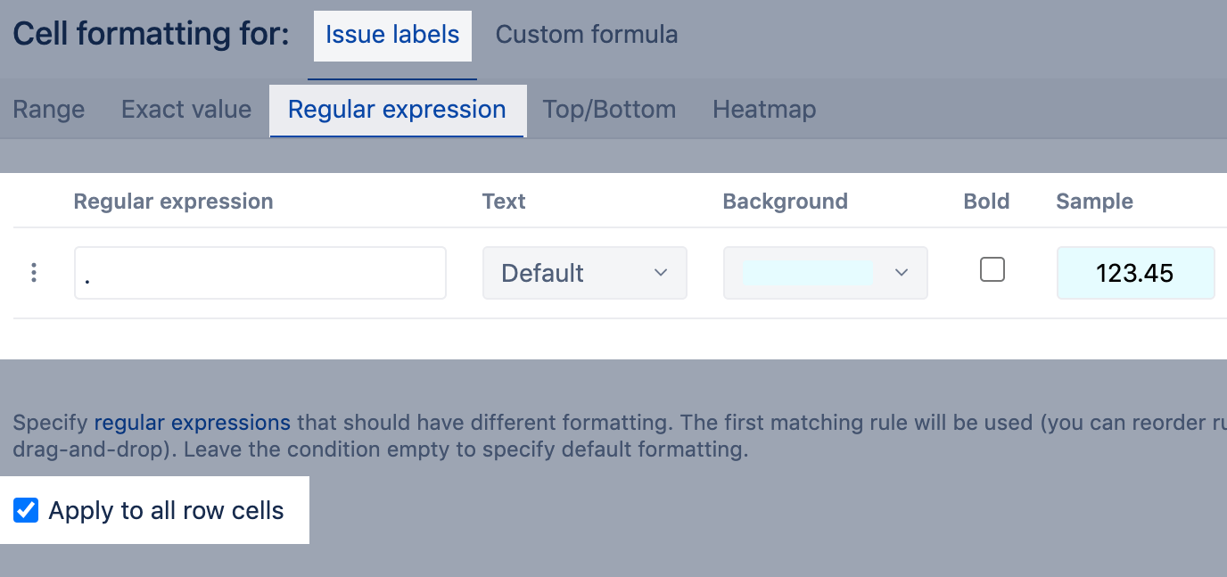 Using a regular expression, color all rows with issues having any label (i.e., having any value in the "Issue labels" column). A regular expression . is used to match any character.