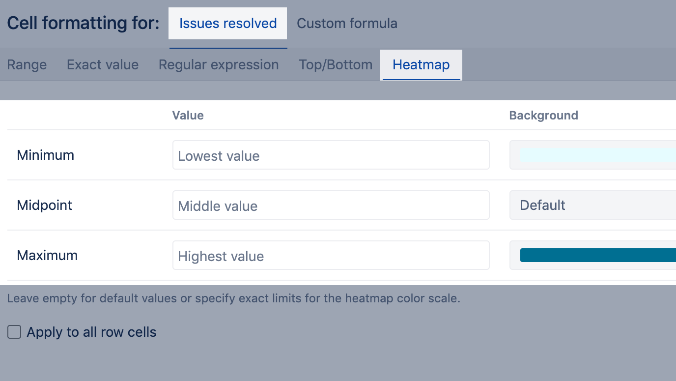 Highlight all values using different intensity colors from the specified color range. By default, minimum, midpoint, maximum values are detected automatically. If necessary, exact values could be specified. For example, specify midpoint value 0 to highlight negative values using one color and positive values using a different color. The heatmap option is recommended for numerical values and dates.