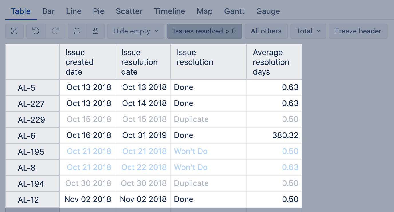 Using exact value condition, color lighter the text in all cells for issues with resolutions Duplicate or Won't Do.
