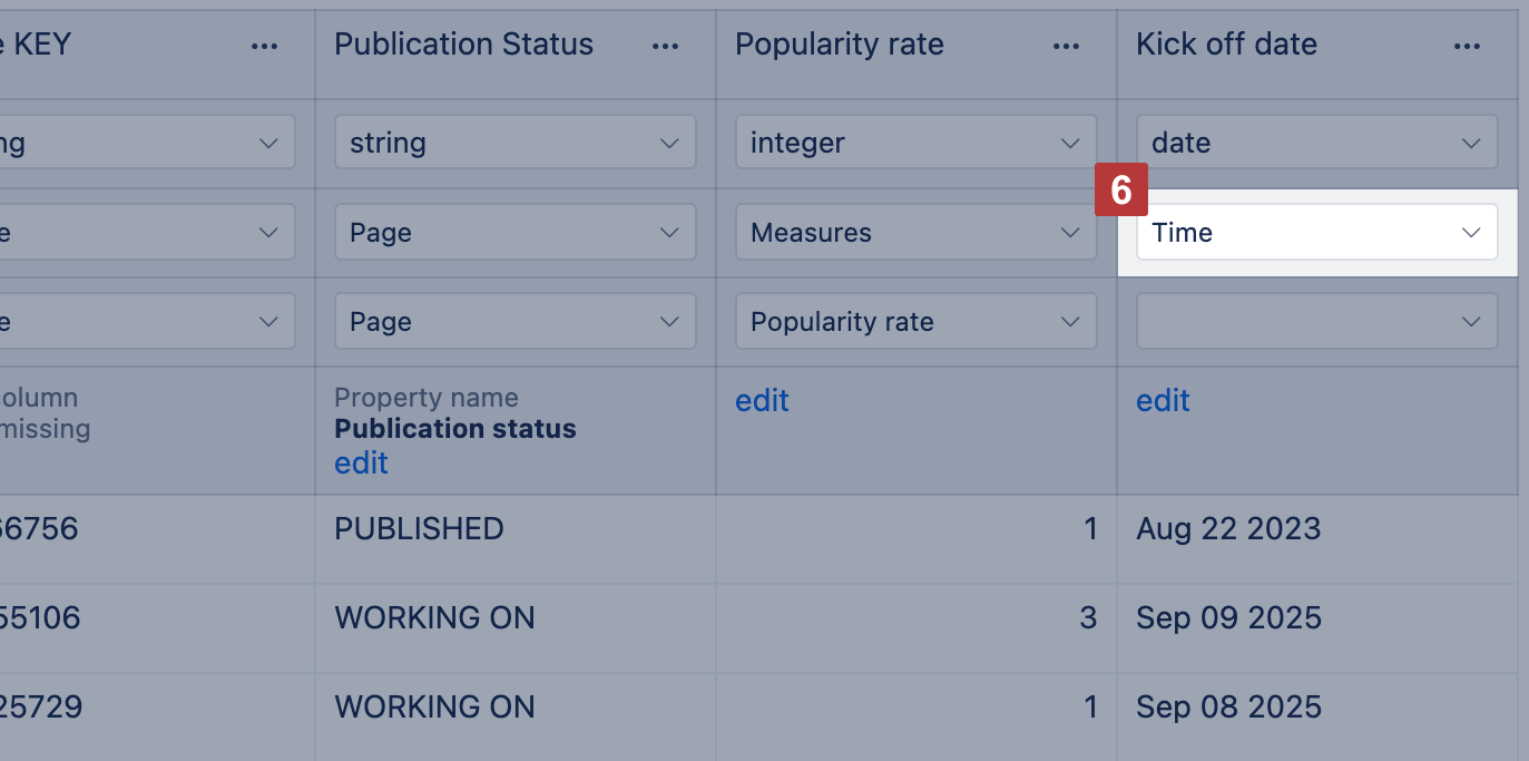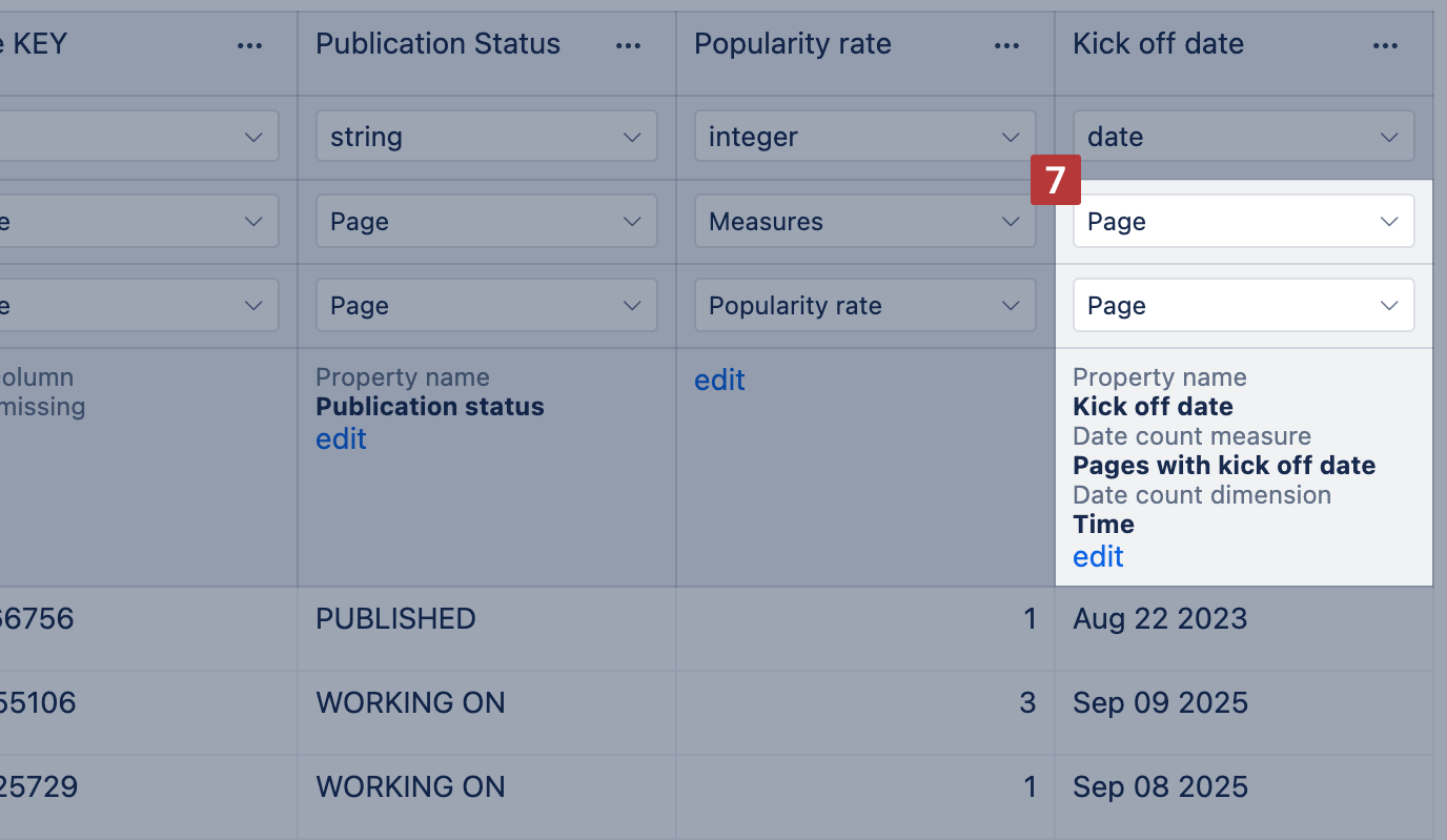 - Another option is to import date as property, measure counting rows with the date field, and map that date count measure to the Time dimension [7]. Map the date column the same way you would do for a property by selecting the same Dimension and Level as you have selected in the preceding column for mapping [2]. In advanced options, enter the Property name, a name for date count measure, and click in the field date count dimension to map the date count measure to the Time dimension. In the example below, besides the page property "Kick off date", eazyBI creates new measure "pages with kick off date" that combined with the Time dimension will show how many pages have a kick off date in a selected period.