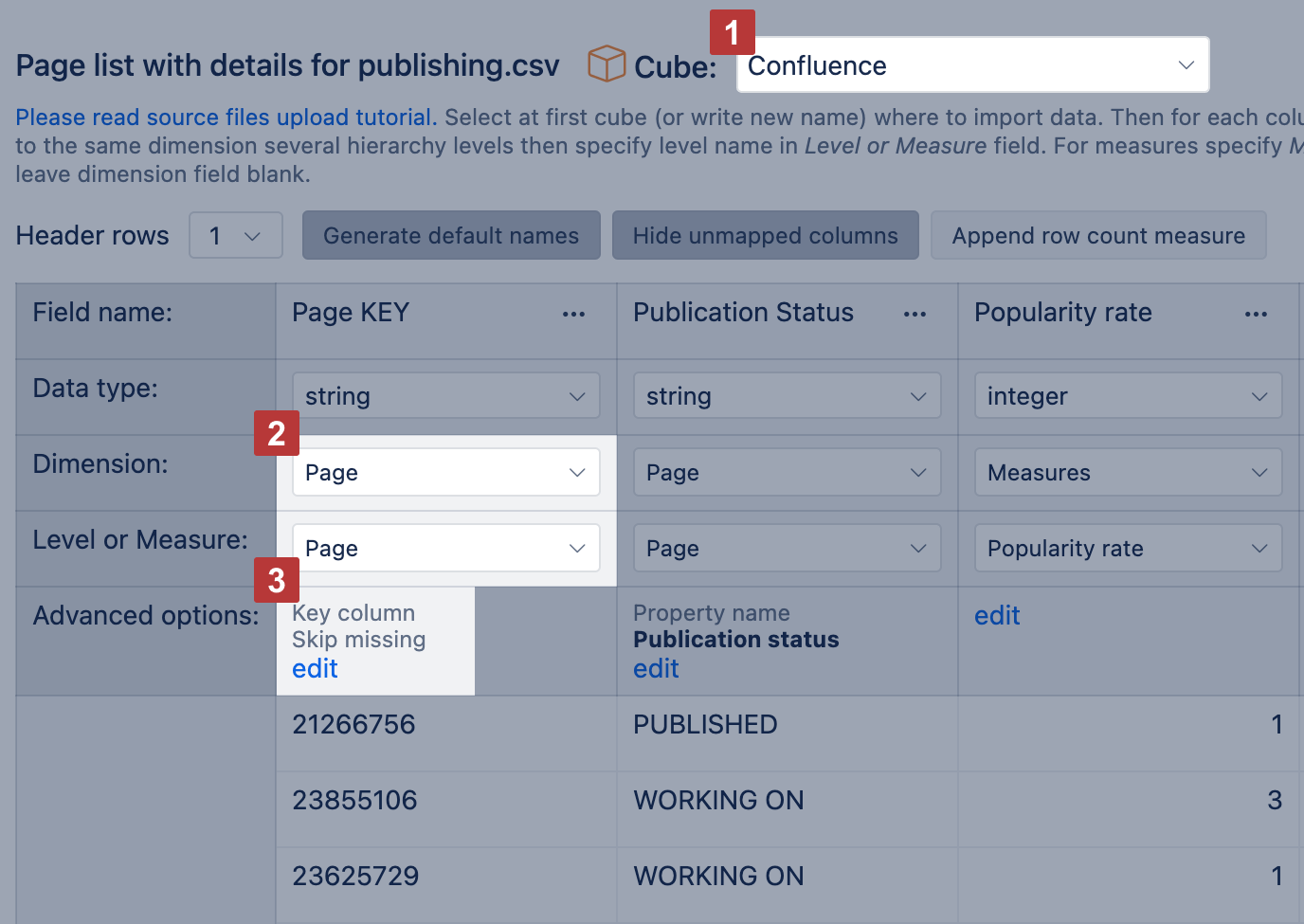 Then specify to which column you would like to map the imported data [2]. In the example below, there is a Page column that I would like to map to Page dimension Page level. In advanced options, the Name column [3] is selected because the page in this column have the name specified exactly as this page name is in eazyBI and this is how eazyBI will be able to find to which page each of the Measures or properties should be imported.