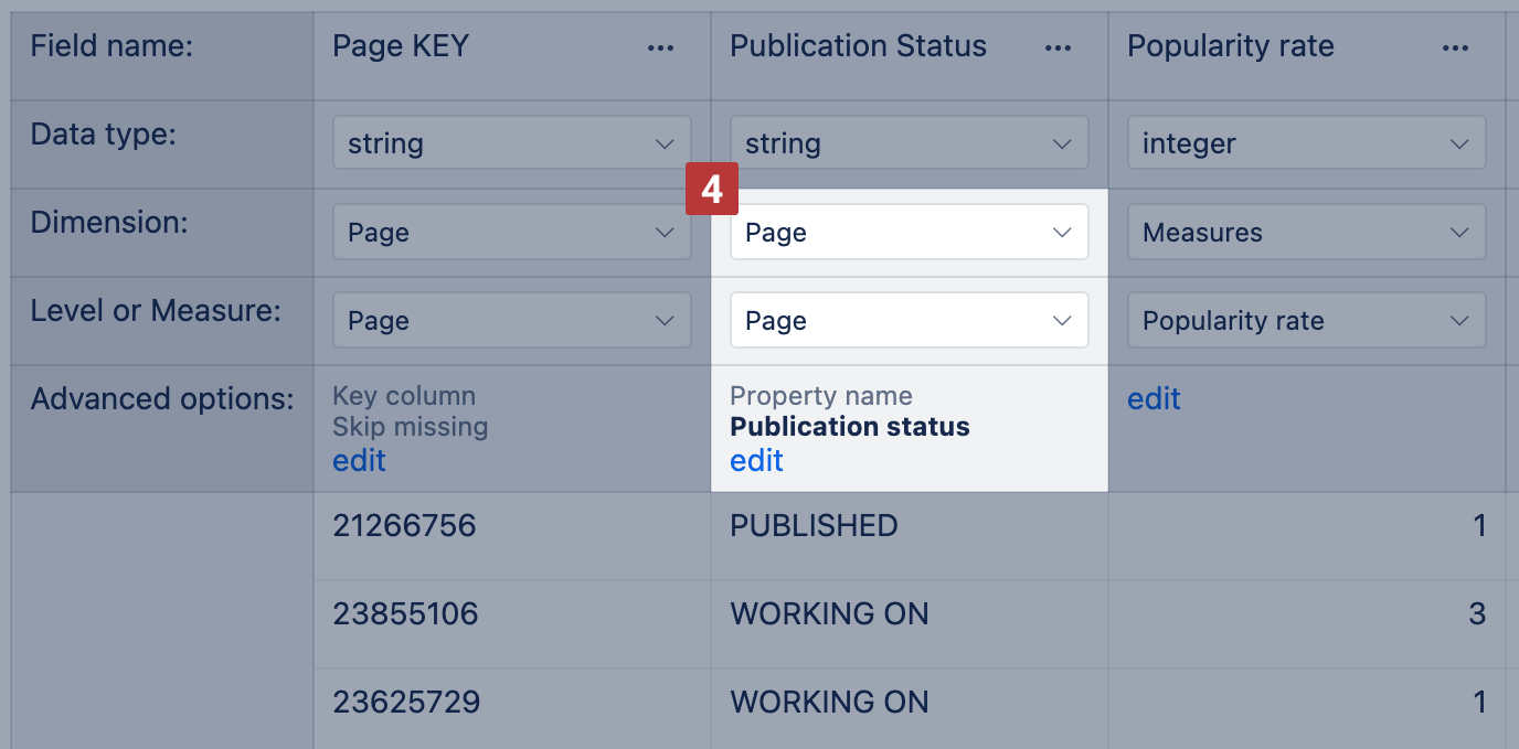 Note that it is also possible to select advanced option Skip missing [3]: in that case if eazyBI does not find Page member with such name as is in this column, the data from that row will not be imported. eazyBI will throw an error if Skip missing option is not selected and you have rows that do not have a match.