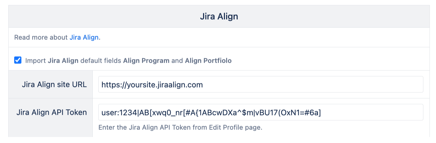 - Jira Align API token, which you can generate API Token (API 2.0 Token) in Align from the Edit Profile page in Align.