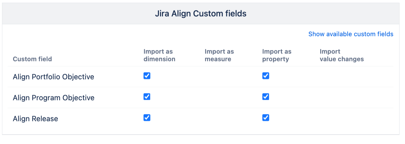 You can import additional Jira Align custom fields as well. You can select Program Objectives and Portfolio Objectives to import linked objectives for imported programs and portfolios. You can also import Align Release mapped to Features in Align as well. Please click on Show available custom fields if you do not see the Align custom field selection after adding Align credentials.