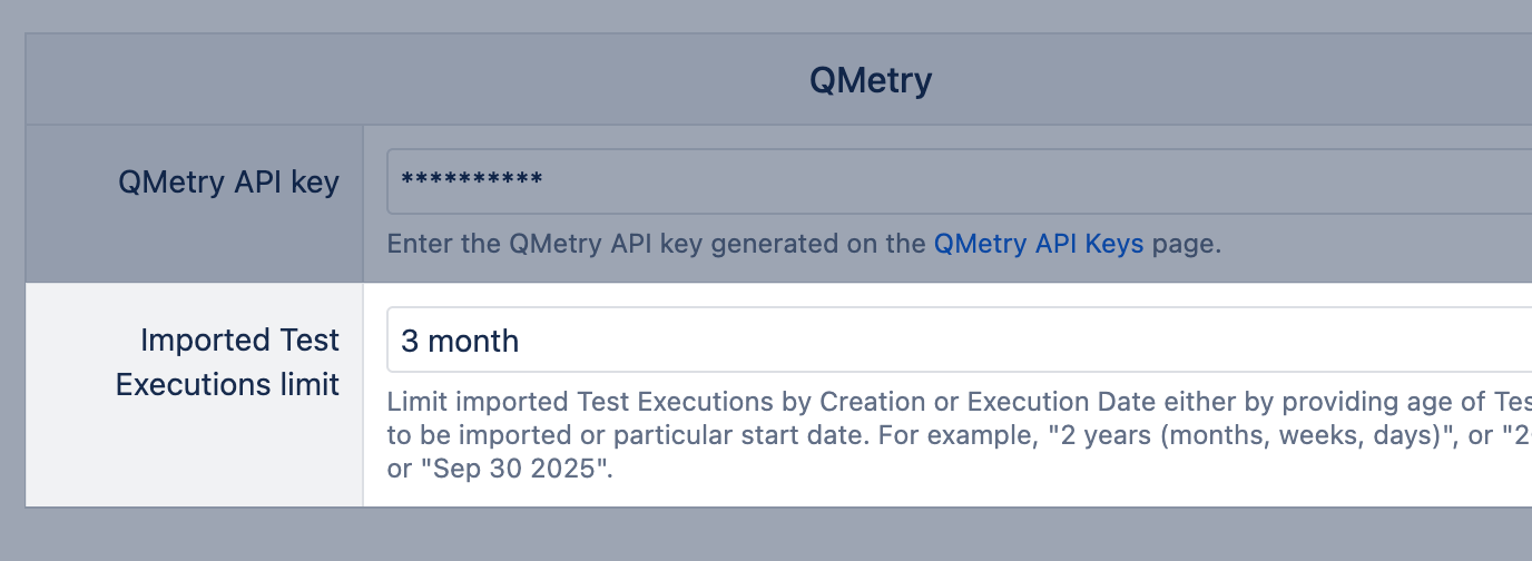 You can set a relative limit for an individual account. In the import options, add the period in the field "Imported Test Execution limit". Set a relative time limit for test executions, like 3 months importing test executions from the last three months, or a particular date, like Jun 14 2025 setting a date range from that date until now. Test executions are imported if they are created (test case is added to the cycle) within the time limit (for scheduled test executions) or the actual start date is within the time limit (for executed or in progress test executions). If no limit is set, all test executions are imported.