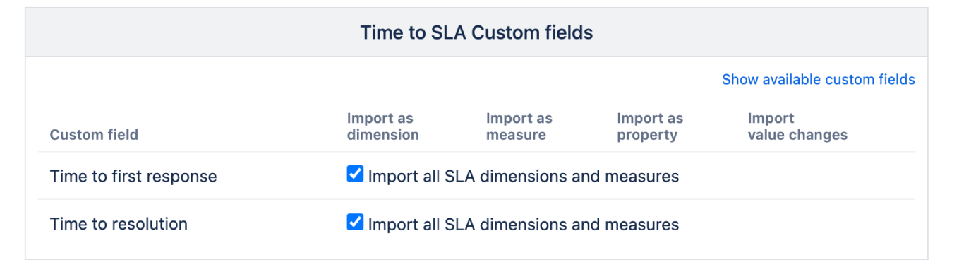 Selected SLA custom fields you would like to analyze from Time to SLA Custom fields selection, for example, Time to first response, Time to resolution. eazyBI will create a set of dimensions, measures, and properties for each selected SLA during data import.