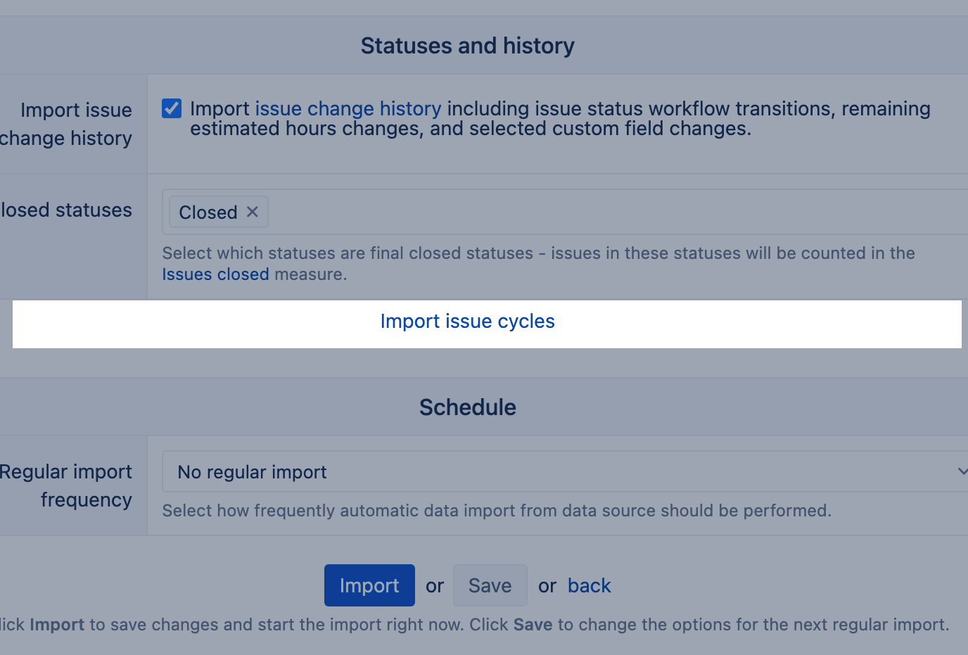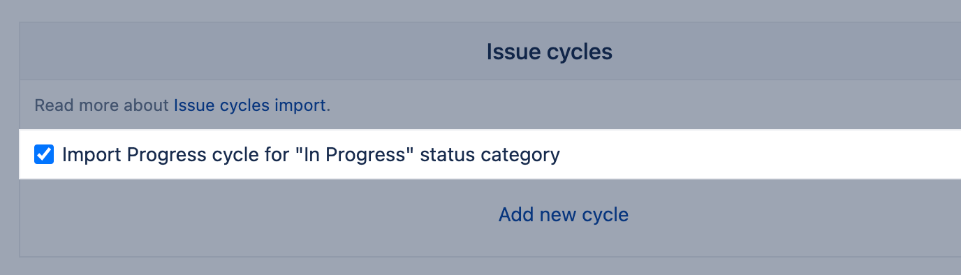 To import an additional set of measures for cycle Progress defined by the Jira status category In Progress, please, select Import Progress cycle for "In Progress" status category in Jira data import options tab General section Issue Cycles.