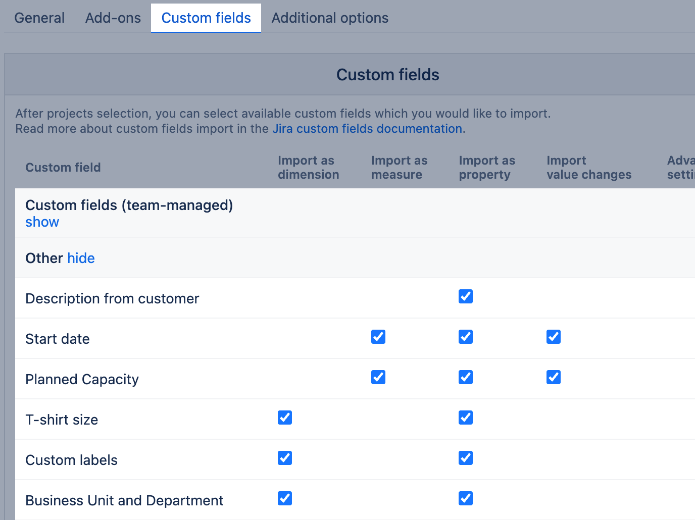 - Custom fields from Jira apps with eazyBI integrations are listed in the Add-ons tab on the import options page.