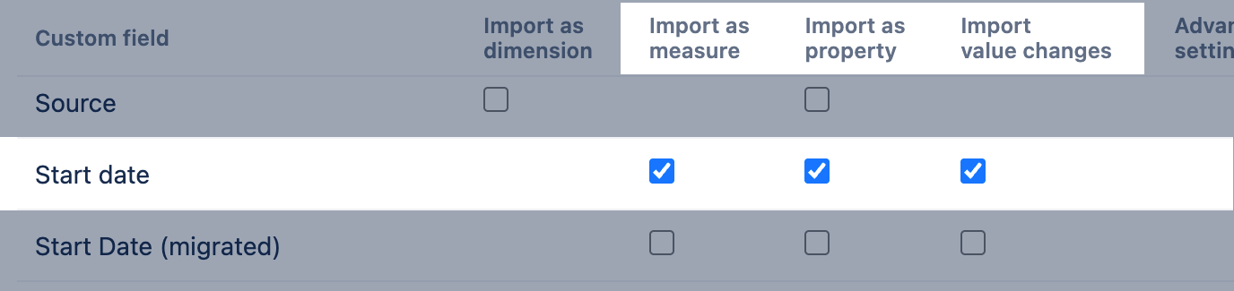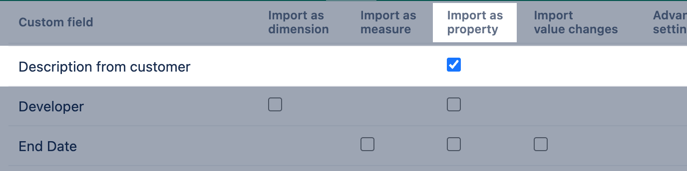 - Custom fields from other Jira apps (no integration with eazyBI) and Jira scripted fields might be missing because eazyBI can not recognize the data type for these fields automatically. To select these fields for import you should specify the data_type in eazyBI advanced settings. More details and examples on how to import Jira calculated and scripted custom fields