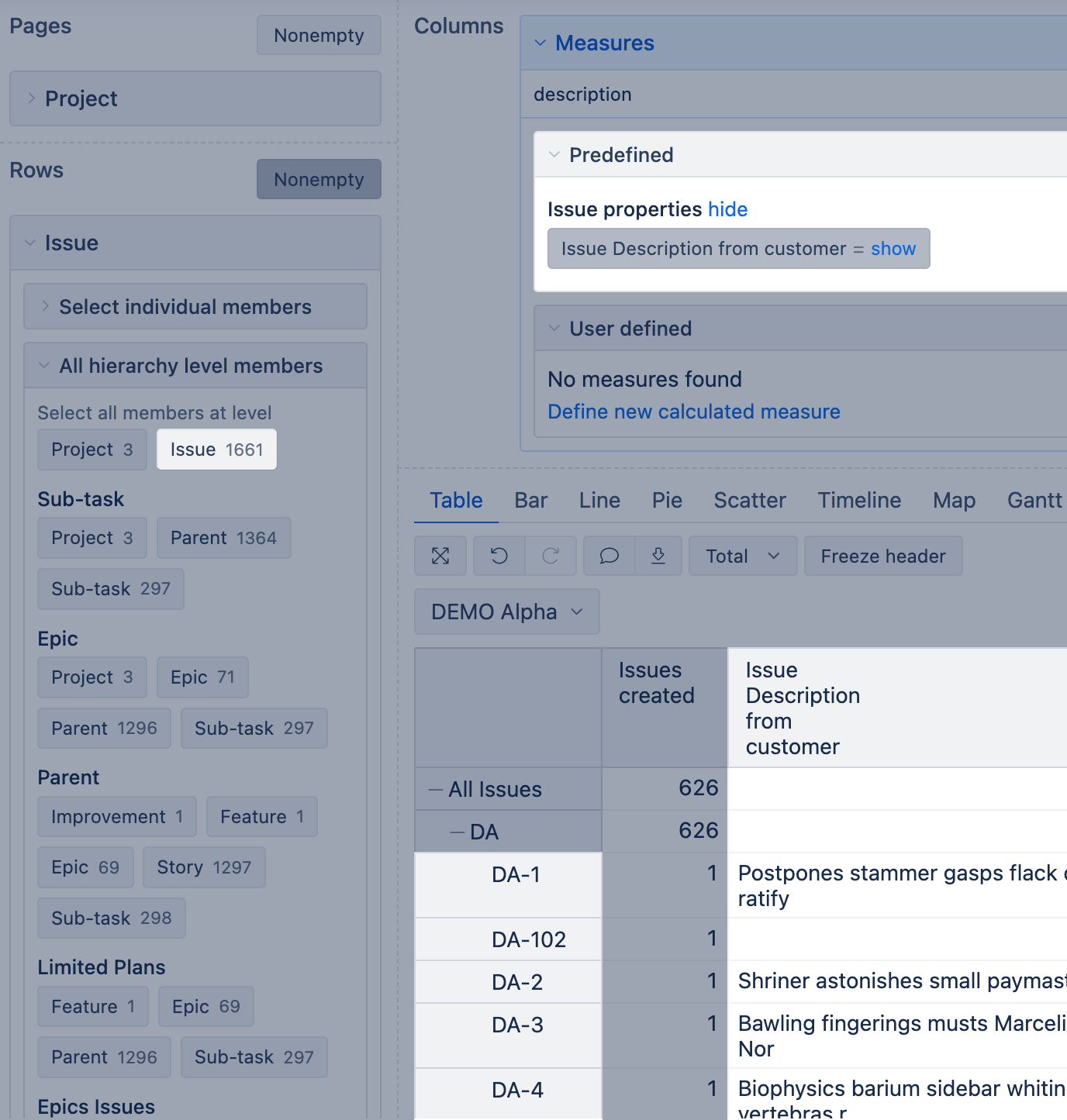 When this type of field is selected and imported, eazyBI creates the value in measure "Issue <text field name>," which represents the text value when using the Issue dimension in the report and shows results at the issue level.