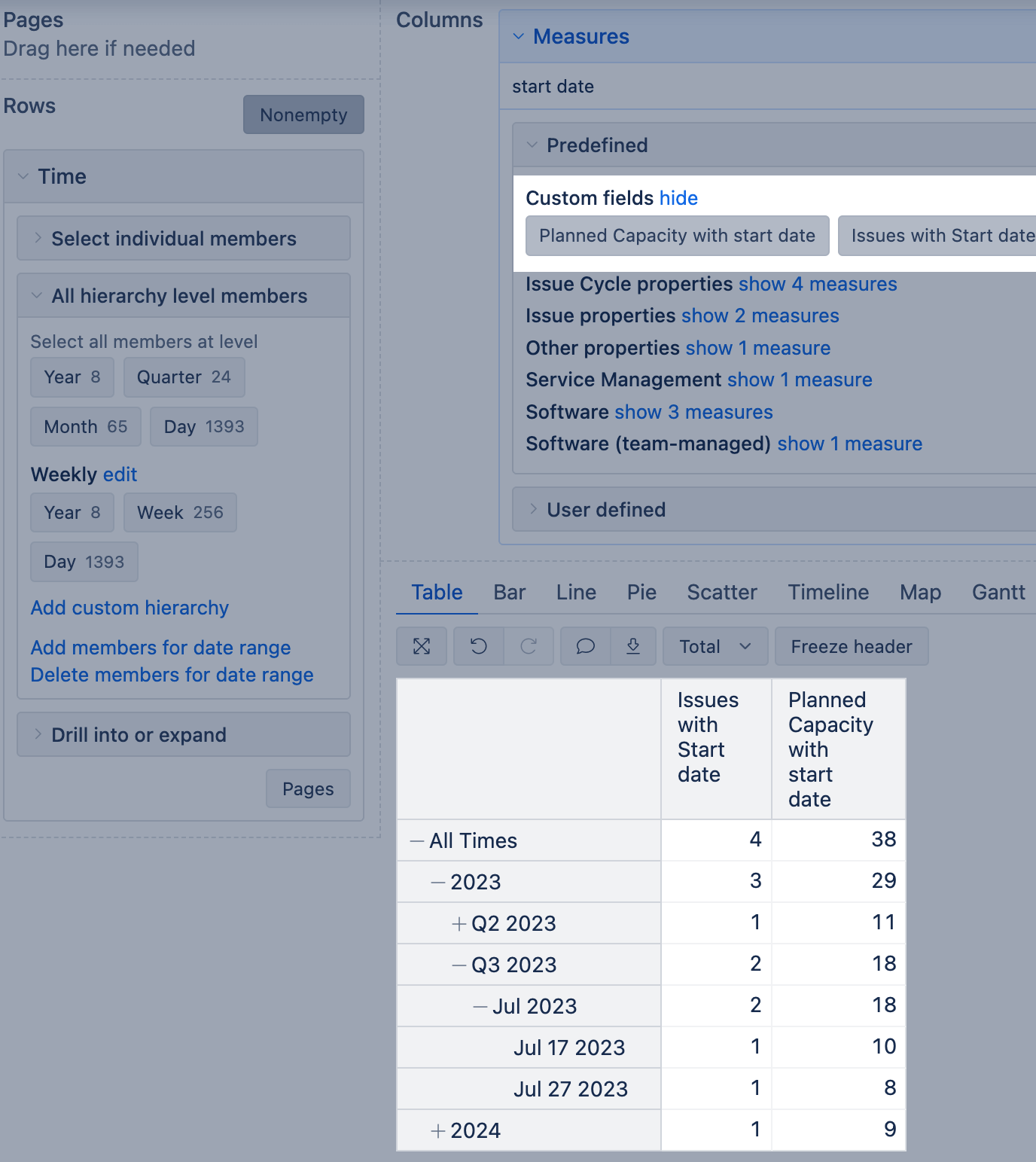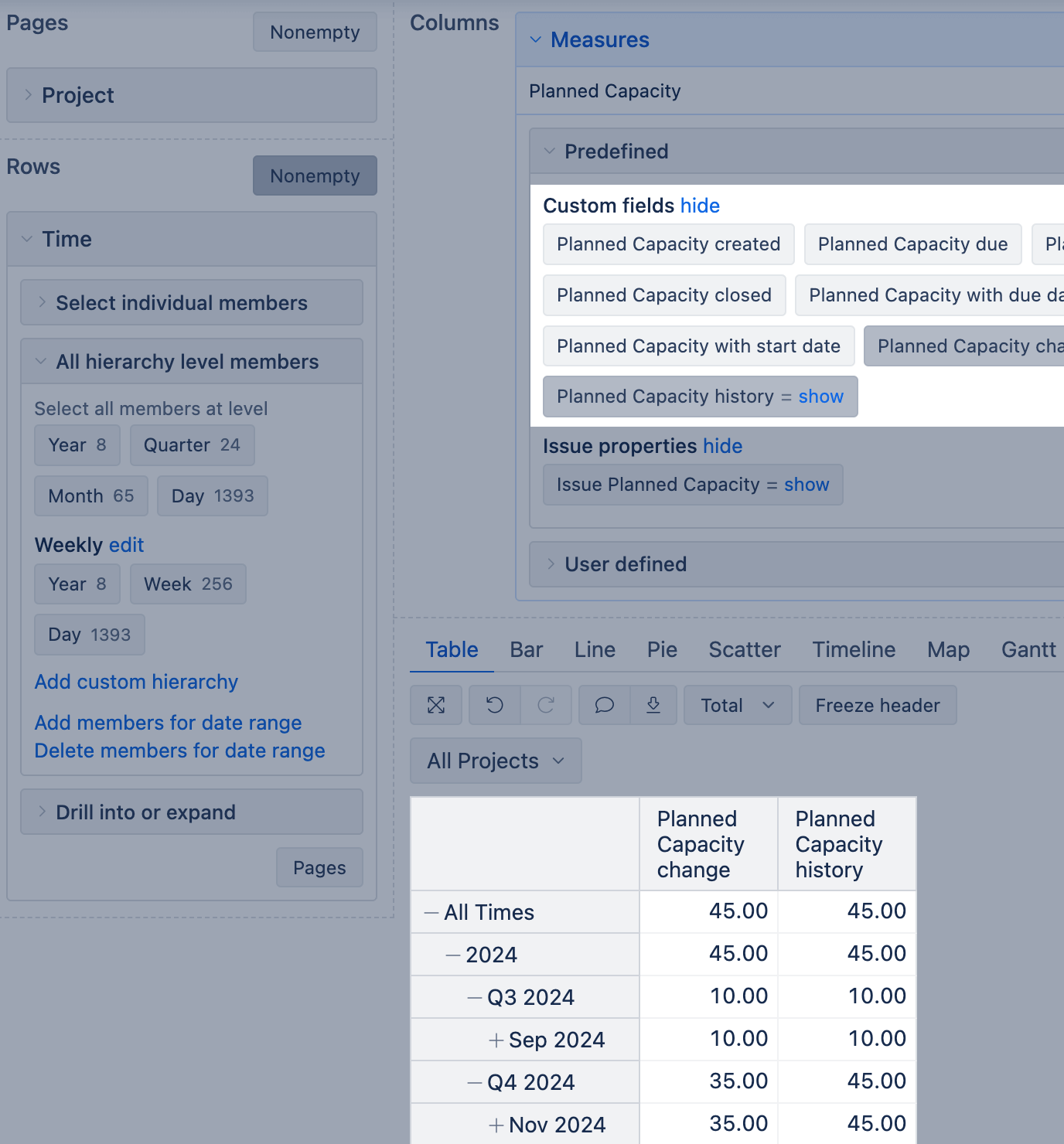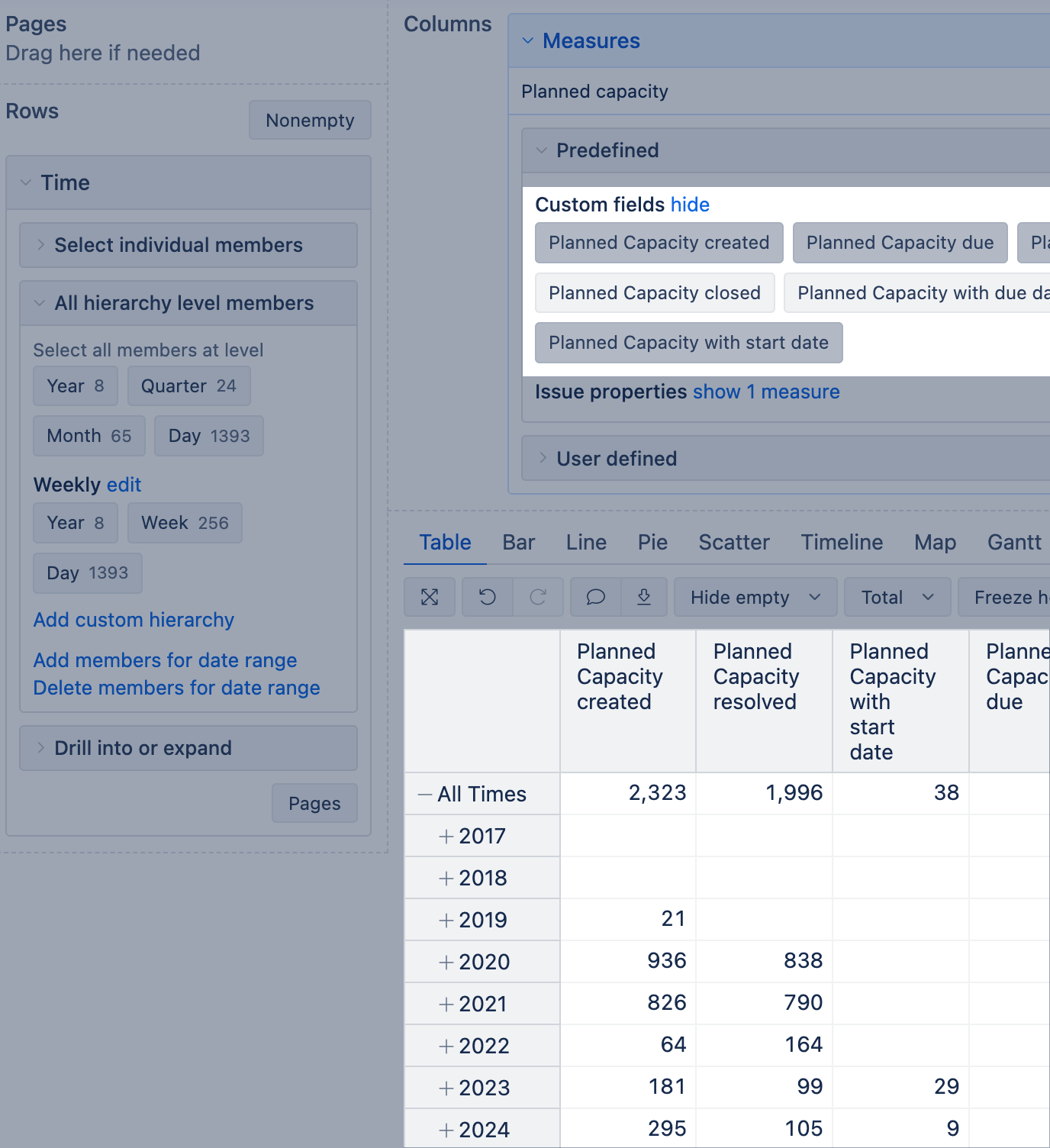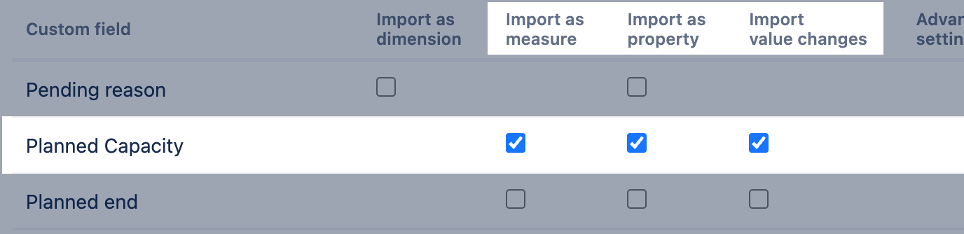 For example, if you import a Number field "Planned capacity," eazyBI will create the following measures: Planned Capacity created, Planned Capacity due, Planned Capacity resolved, Planned Capacity closed, Planned Capacity with due date, Planned Capacity with planned start date, Planned Capacity change, Planned Capacity history. And 6 hidden measures: Issues with Planned Capacity created, Issues with Planned Capacity due, Issues with Planned Capacity resolved, Issues with Planned Capacity closed, Planned Capacity added, and Planned Capacity removed.