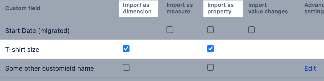 You can import custom fields as dimensions, measures, and properties; the available options depend on the custom field type. For some custom field types, you can also import value changes. The following chapters describe how each custom field type is represented in eazyBI and how you can use it in the reports.