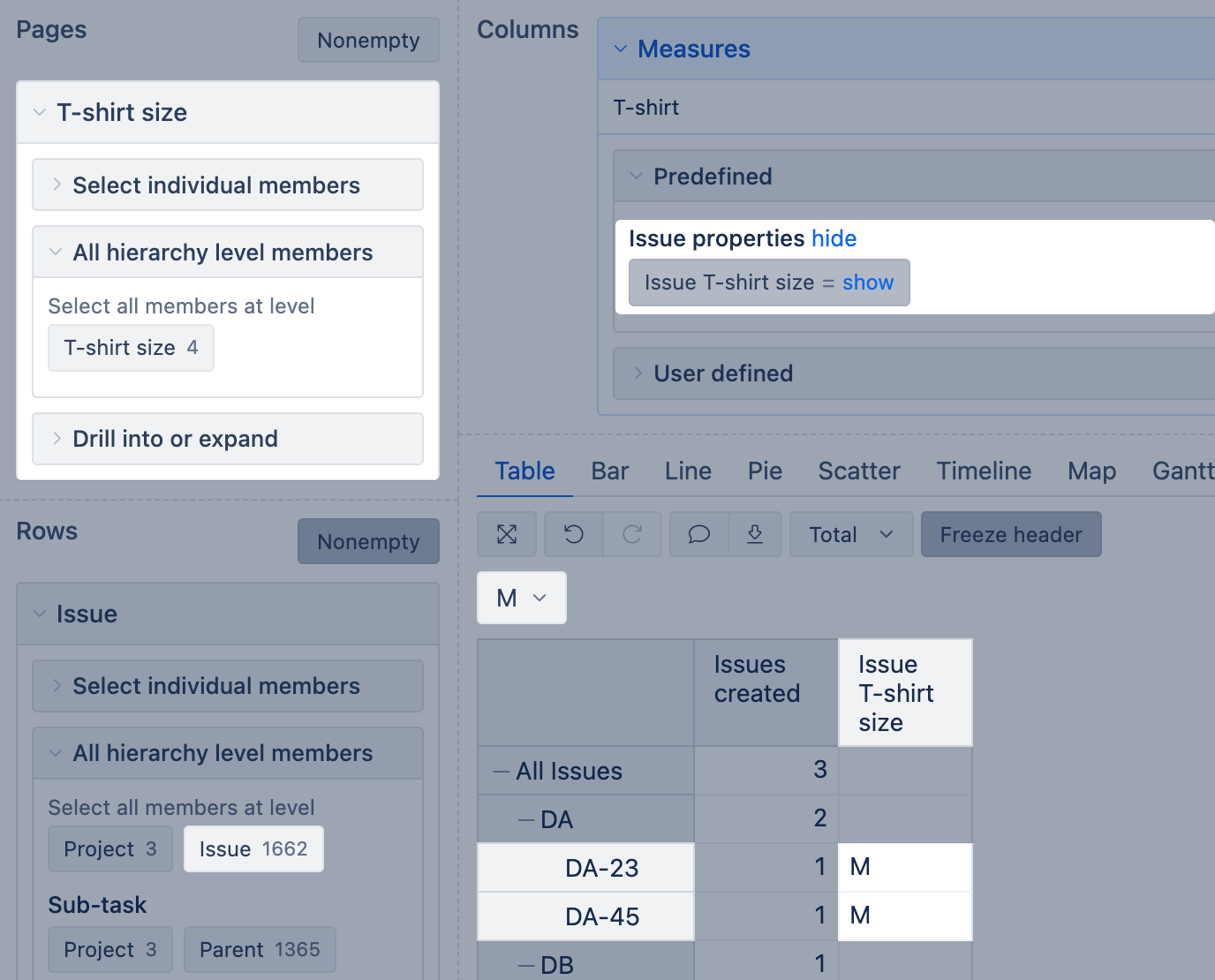 For example, if you have the single-choice field "T-shirt size", eazyBI creates the property "Issue T-shirt size" and dimension "T-shirt size". You can select this property from the Measures to show the current T-shirt Size value for each issue, and a dimension "T-shirt Size" to filter results.