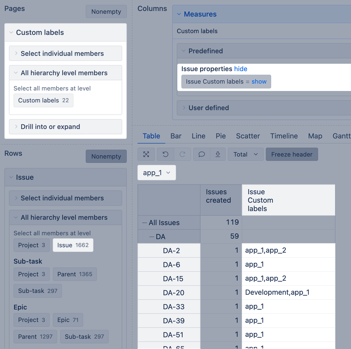 For example, if you have the multiple choice field "Custom labels", eazyBI creates the property "Issue Custom labels" and dimension "Custom labels". You can select this property from the Measures and analyze results also by the particular dimension.