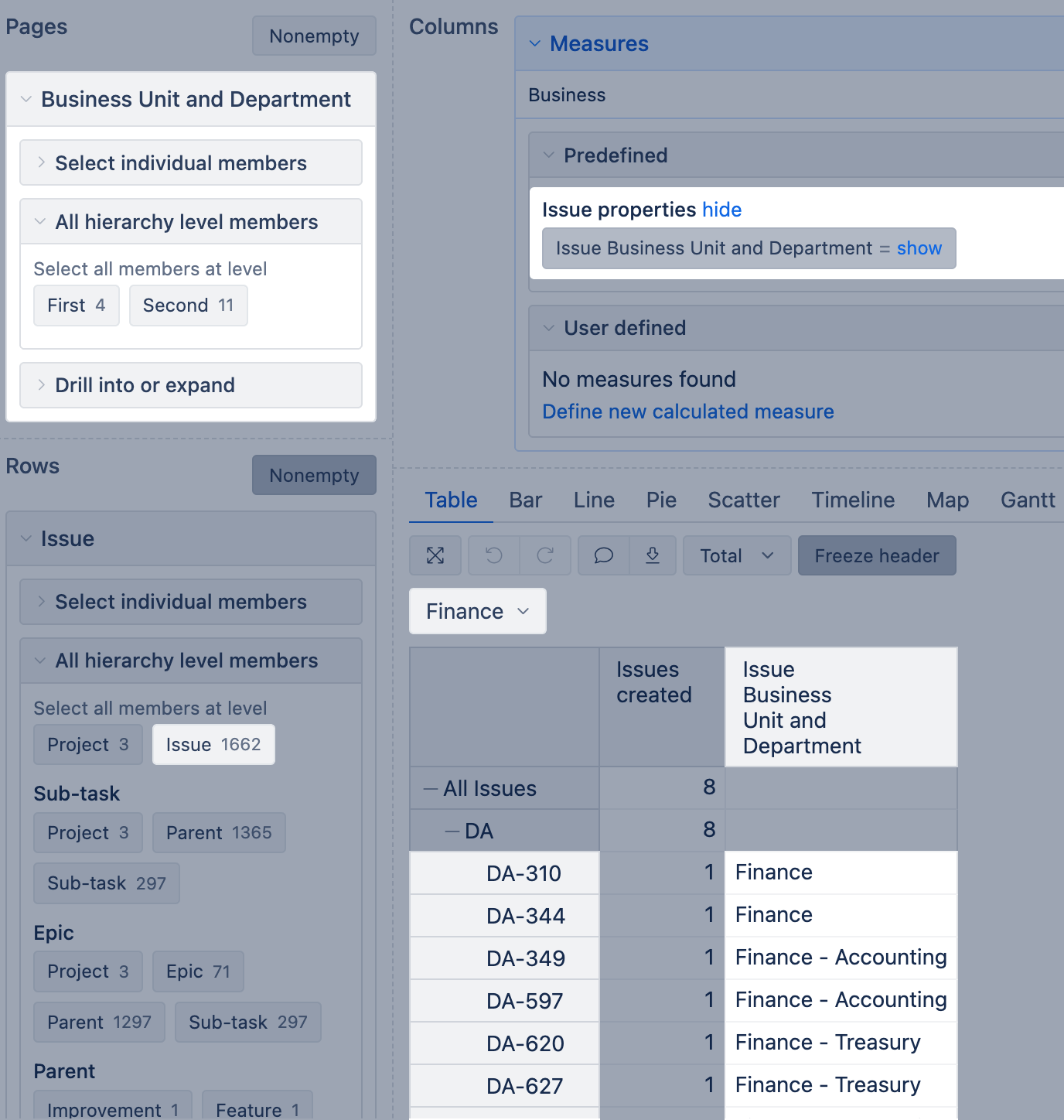 For example, if you have the cascading field "Business Unit and Department," eazyBI creates the property "Issue Business Unit and Department" and dimension "Business Unit and Department". You can select this property from the Measures and analyze results also by the particular dimension. This dimension will have automatically two levels (First, Second) in the hierarchy and you can filter report by each of them.