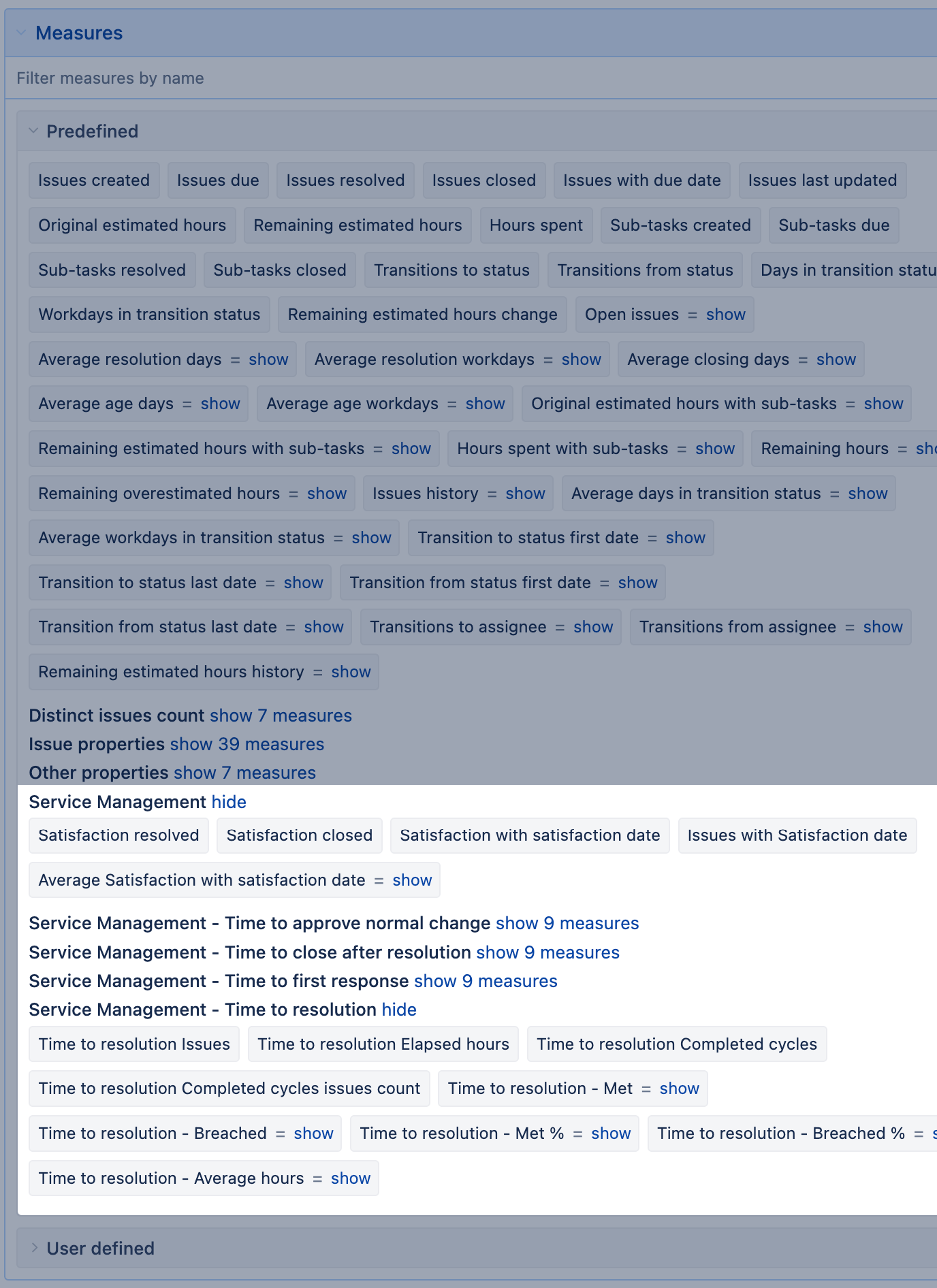 Satisfaction resolved | The measure Satisfaction resolved shows the total satisfaction value of the resolved issues. The measure is mapped to the time dimension by the issue resolution date. |
