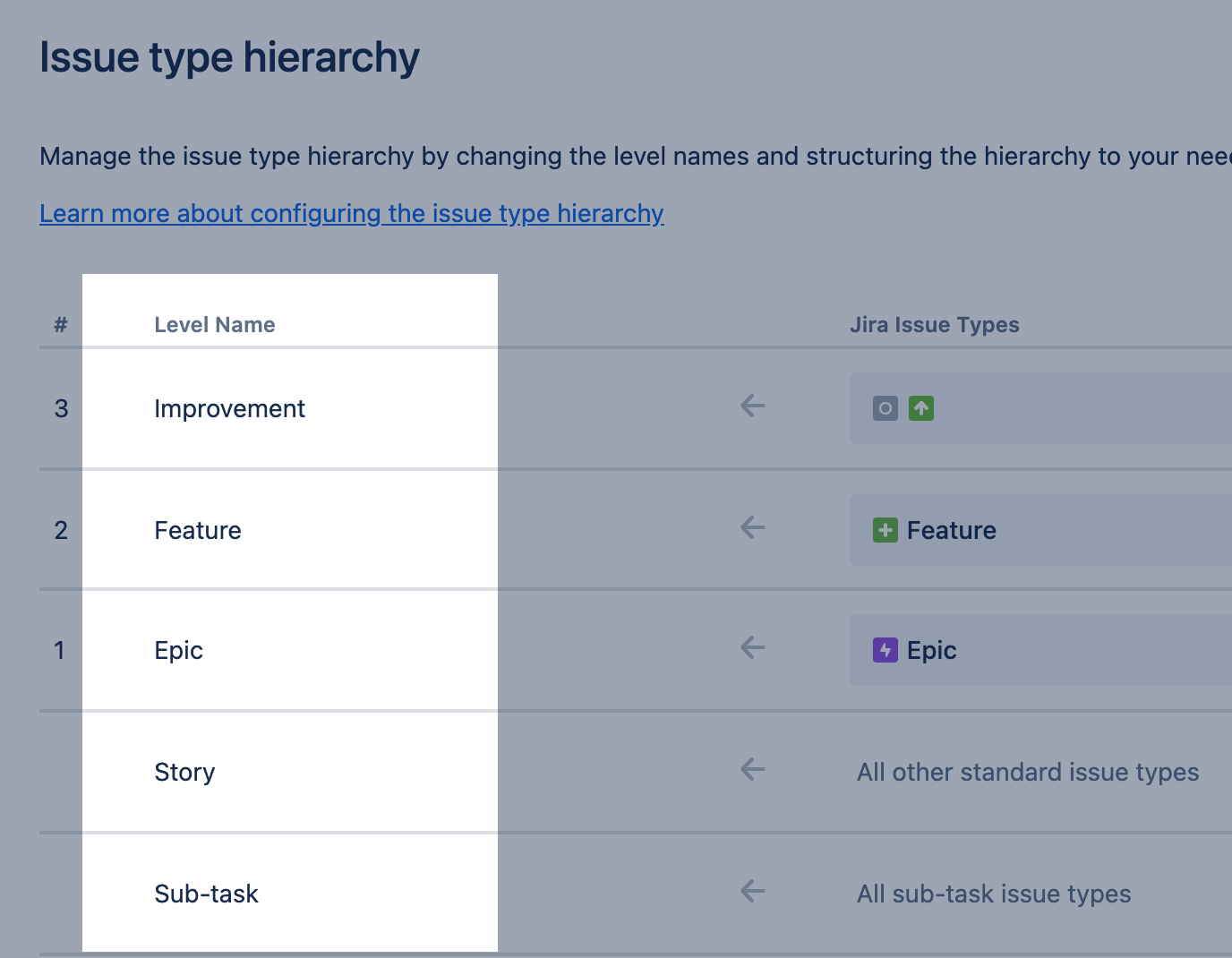 [jira.plans] hierarchy_level_names = ["Improvement", "Feature", "Epic", "Story", "Sub-task"]