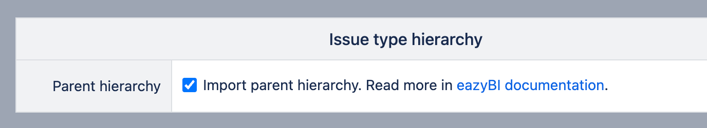 Parent Link | The Parent Link custom field can be imported as a property. Importing the Parent Link custom field will create a new hierarchy Plans in the Issue dimension on Data Center. See the configuration below for the Parent issue hierarchy on the Jira Cloud. In addition, eazyBI creates a set of dimensions and properties representing the parent issues: