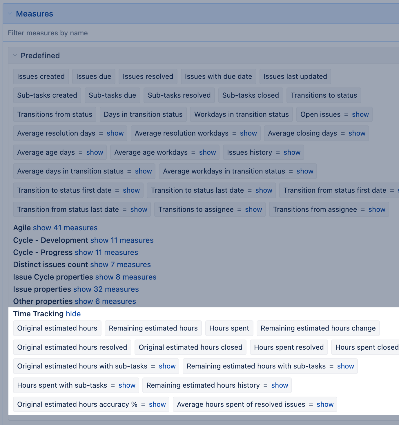 eazyBI creates a set of additional measures organized in the predefined measures section Time Tracking.