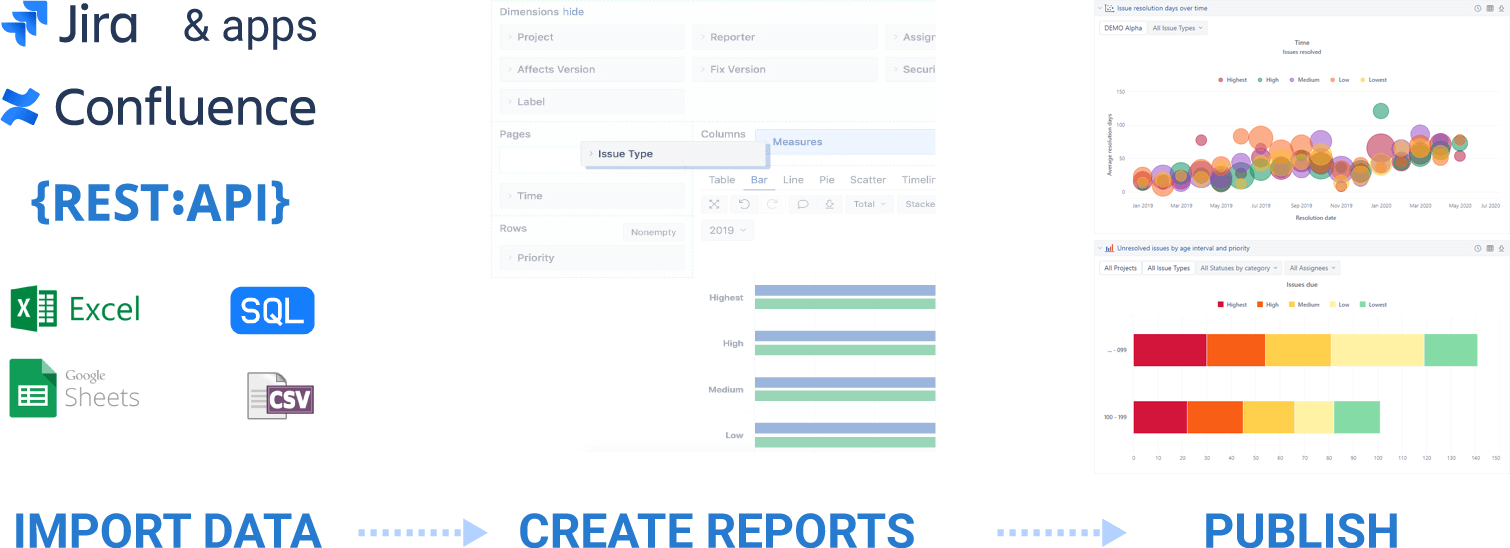 eazyBI is a powerful tool, providing easy-to-use drag-and-drop creation of custom reports, charts, and dashboard gadgets. Import your data from excel, CSV file, Google Spreadsheets or using REST API, or SQL select. Visualize, and analyze all your data using many chart types and share reports with your coworkers.