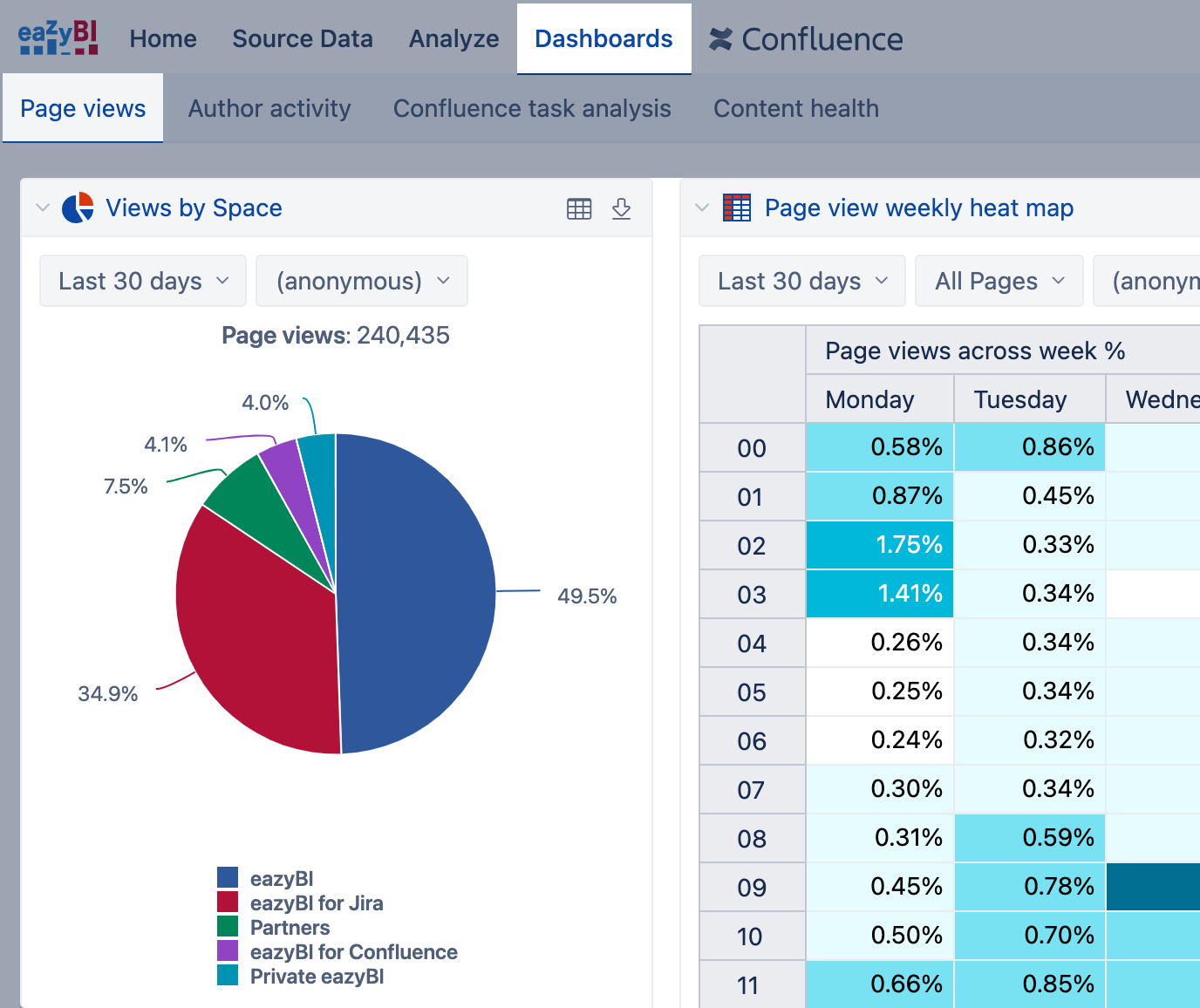 eazyBI is now available also as an app for Confluence Cloud and Confluence Server (in addition to the popular eazyBI app for Jira). eazyBI provides easy-to-use drag-and-drop creation of custom reports, charts, and dashboard gadgets from Confluence and other data sources. Visualize and analyze all your data using many chart types, and share reports with your coworkers.
