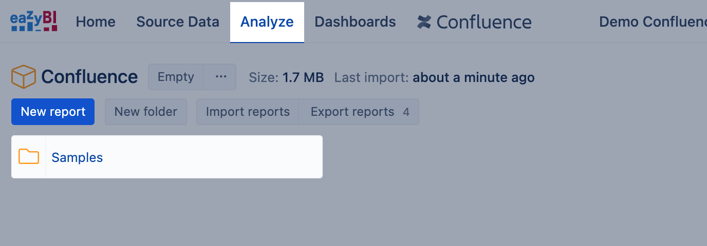 After importing data from Confluence, go to tab Analyze and start to explore data by looking through Sample reports or creating New report. It would be essential to understand the report building blocks, measures, and dimensions, before you start creating eazyBI reports.