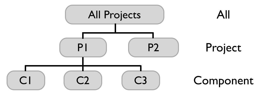 Each dimension has either just detailed level of all dimension members or has a hierarchy with several levels. For example, Project dimension has Project and Component levels.