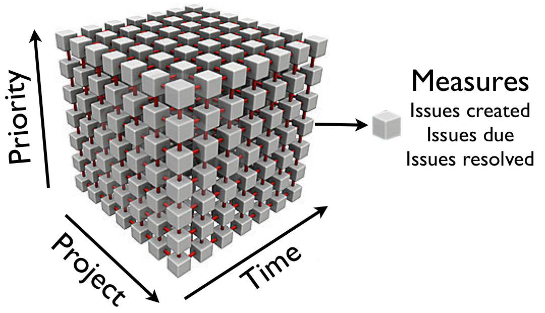 Below is an example of Issues cube that has Project, Priority and Time dimensions and has measures Issues created, Issues due and Issues resolved. Each detailed cube “cell” contains a number of issues created, due and resolved for a particular project, priority and time period.