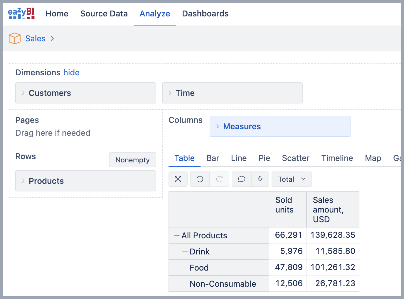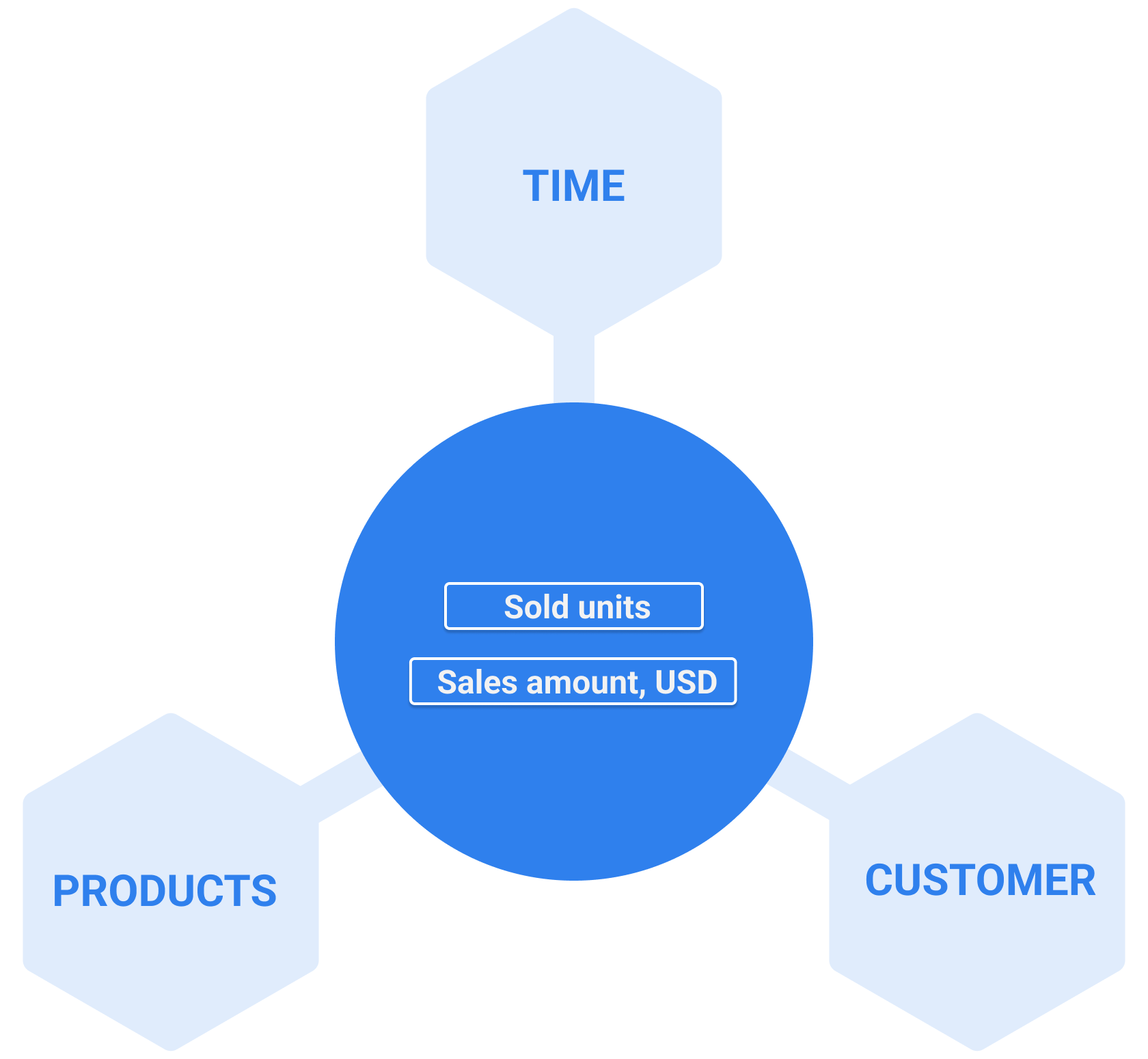 Example for Sales cube. The data source contains customers, products, date of purchase, and quantity details of how many units and the sale amount. During data import, eazyBI creates a data model with four tables: