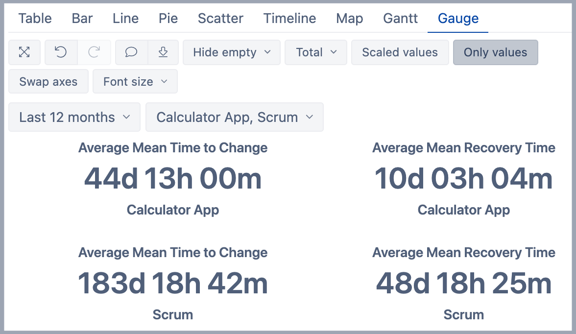 - "Average Mean Time to Recovery" - average resolution days for incidents (issues with pre-defined incident issue types).