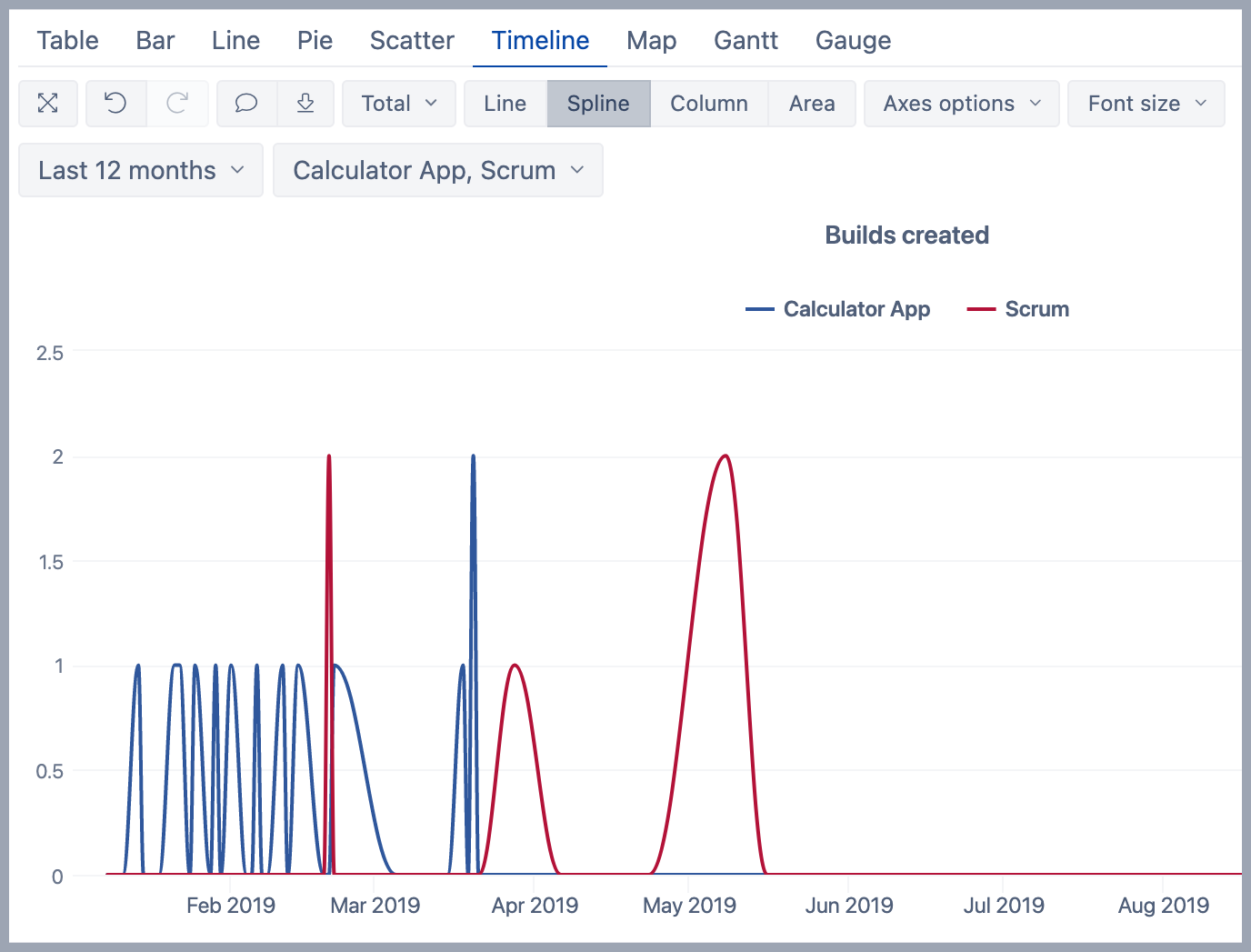 Measure Builds created counts how many builds are for commits related to the issue. To have a continuous line use standard calculation "Empty as 0" for "Builds created" and create a new measure "Builds created (empty as 0)". As eazyBI doesn't allow having the same name used for another measure, then use a little trick with an empty space and rename the calculated measure to "Builds created " using the option "Edit calculated". Remove measure "Builds created".