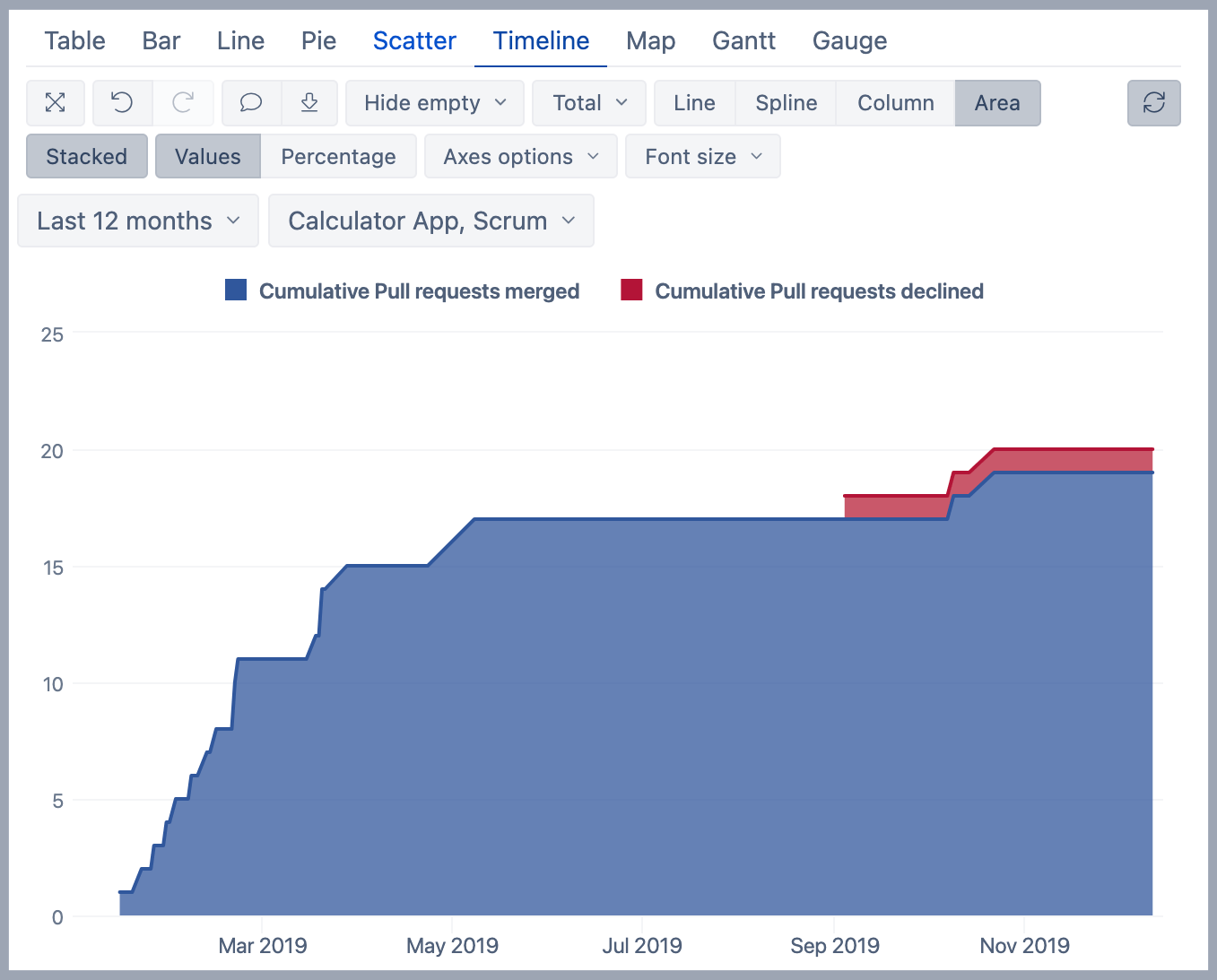 To build this report start with the table view and select the Time dimension in Rows. Then in the Measures dimension, select measure Pull request merged and Pull requests declined, then unselect default measure "Issues created".