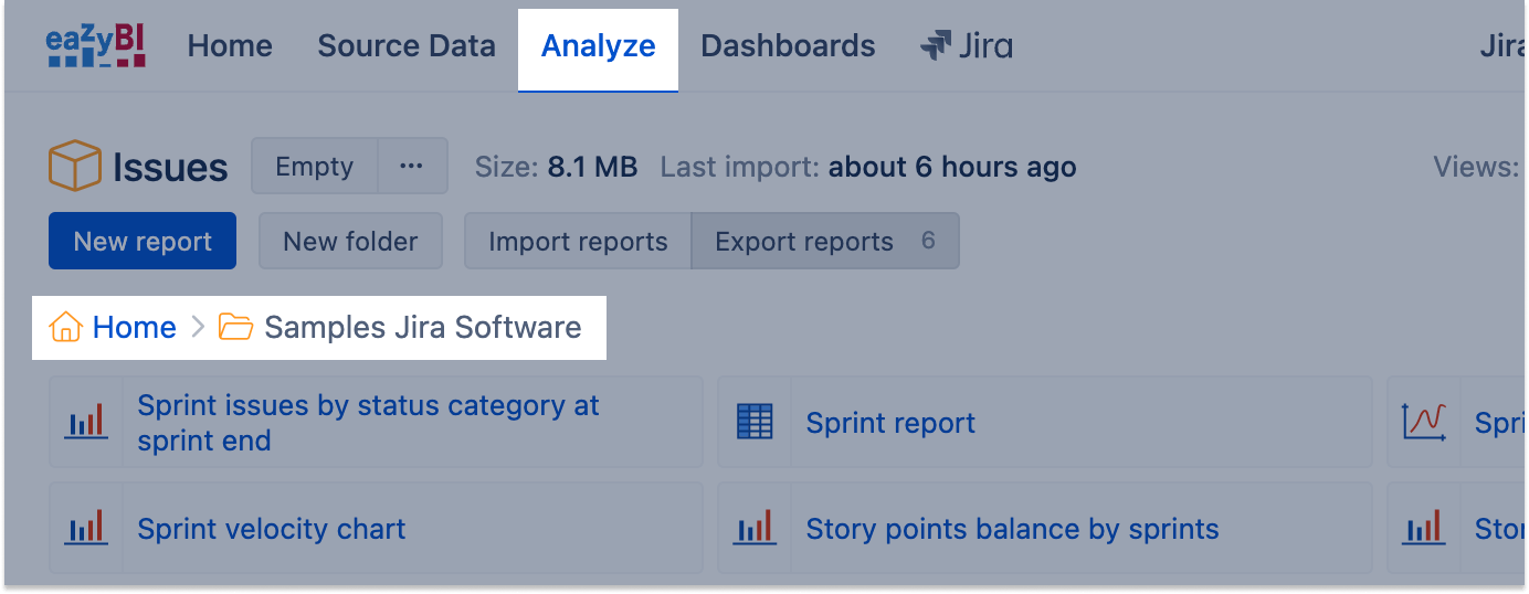 eazyBI will create a sample folder Samples Jira Software if you will import Sprint as a dimension and the Import sample reports option is enabled for the account (please see how to import Data from Jira for more details). Reports on Story points will be created if the custom field Story Points is selected for import as well.