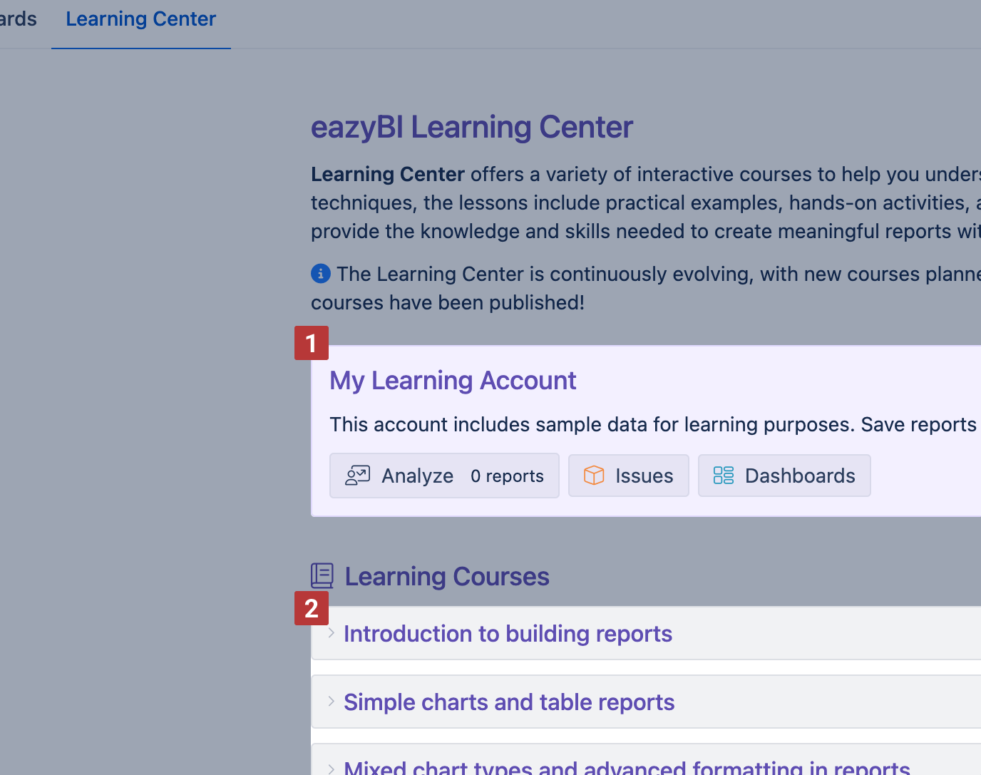 If you are not using eazyBI for Jira Cloud, you can sign up at eazybi.com/learning_center to access the Learning Center.