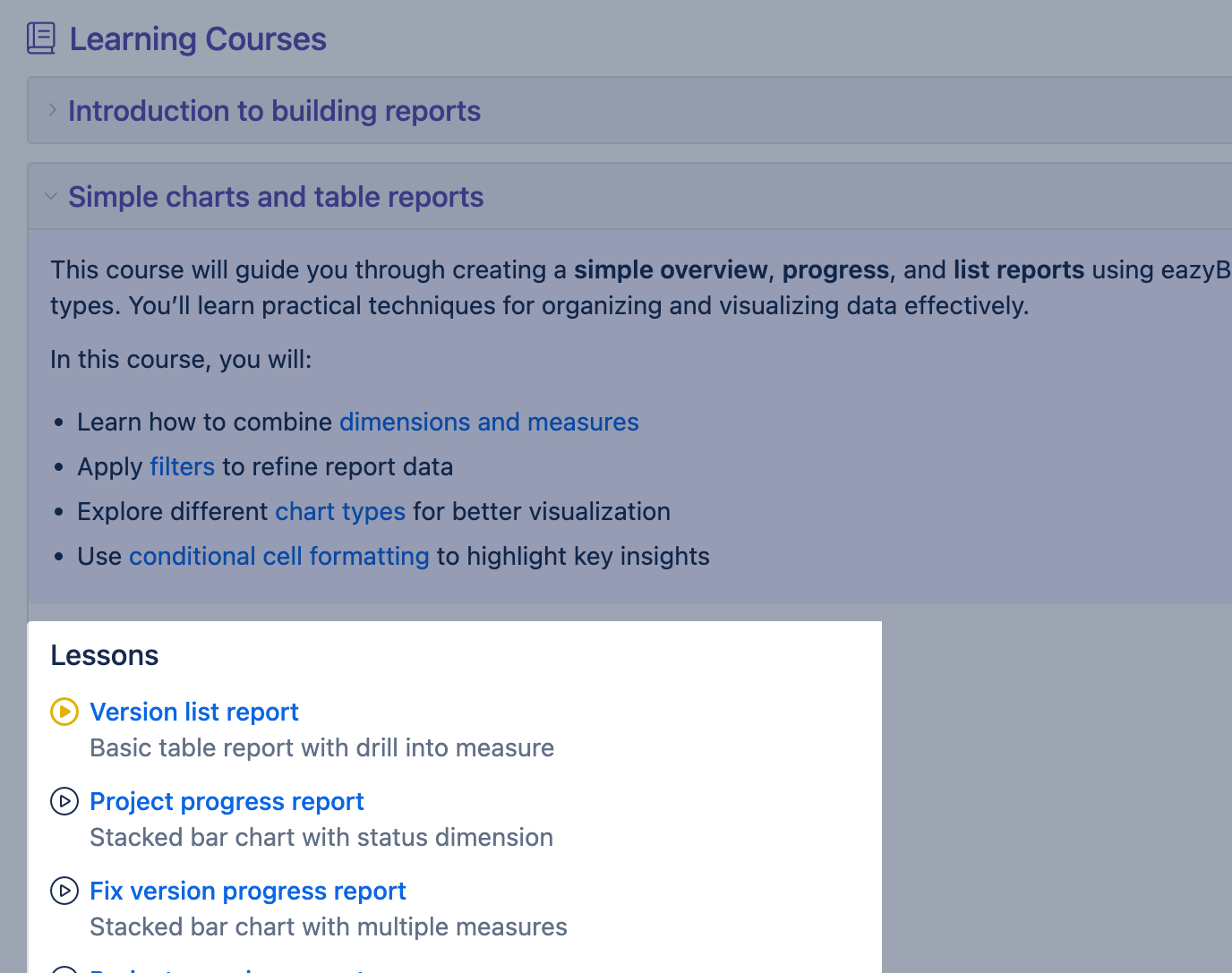 The Learning Center provides interactive courses to help you explore and work with eazyBI at your own pace. It offers structured lessons on various topics, featuring practical examples and hands-on activities to deepen your understanding. All courses are open to everyone, free of charge.