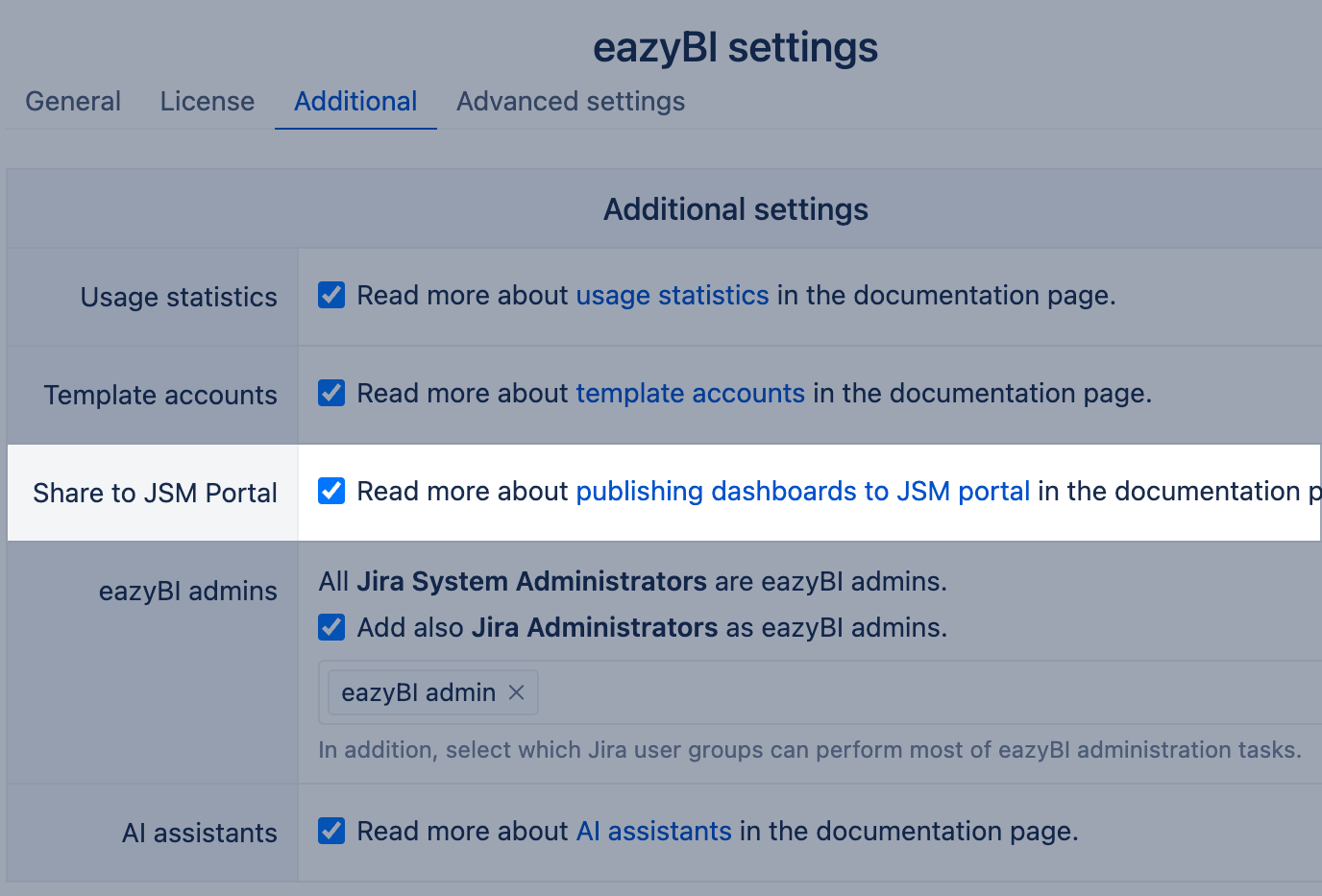 To enable the JSM sharing option in eazyBI for Jira Data Center, go to Settings → Additional and select "Share to JSM portal"