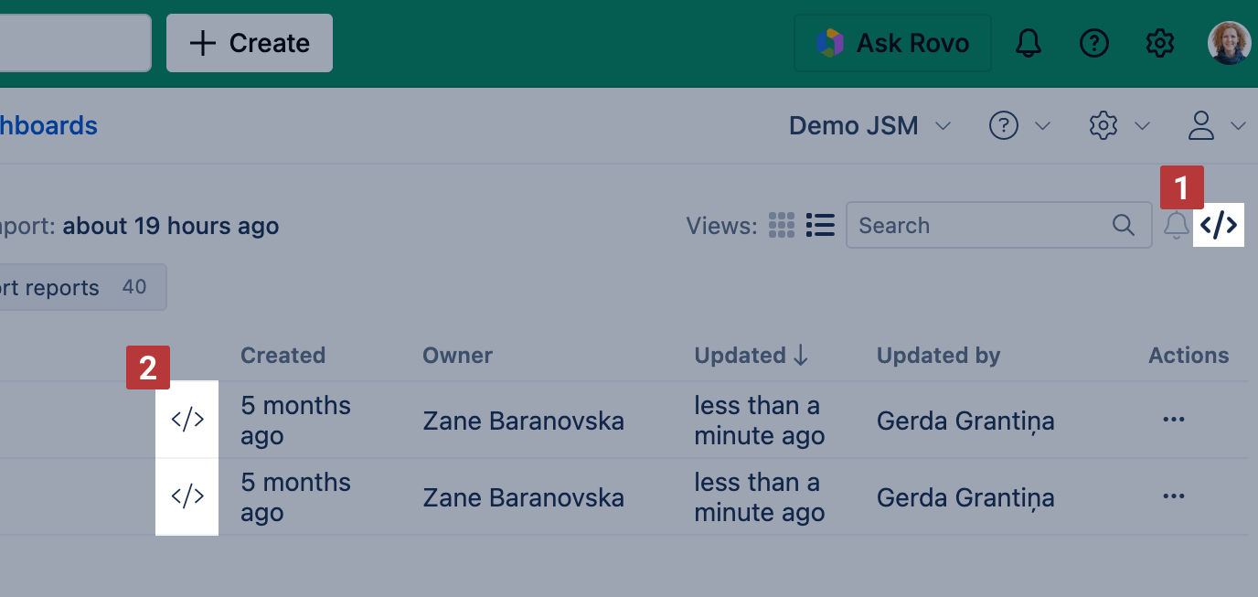 To find all reports published with a public access token, open the Analyze tab and use the Has embed token icon (</>) [1] to display them in the report list [2].