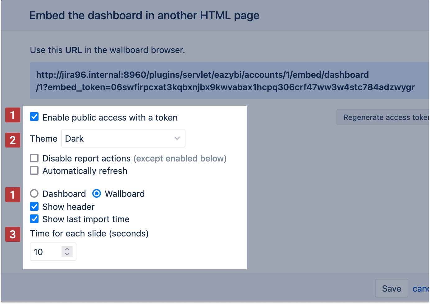 Wallboard mode has the same options as embedding dashboards in an iframe, except the possibility to export report results.