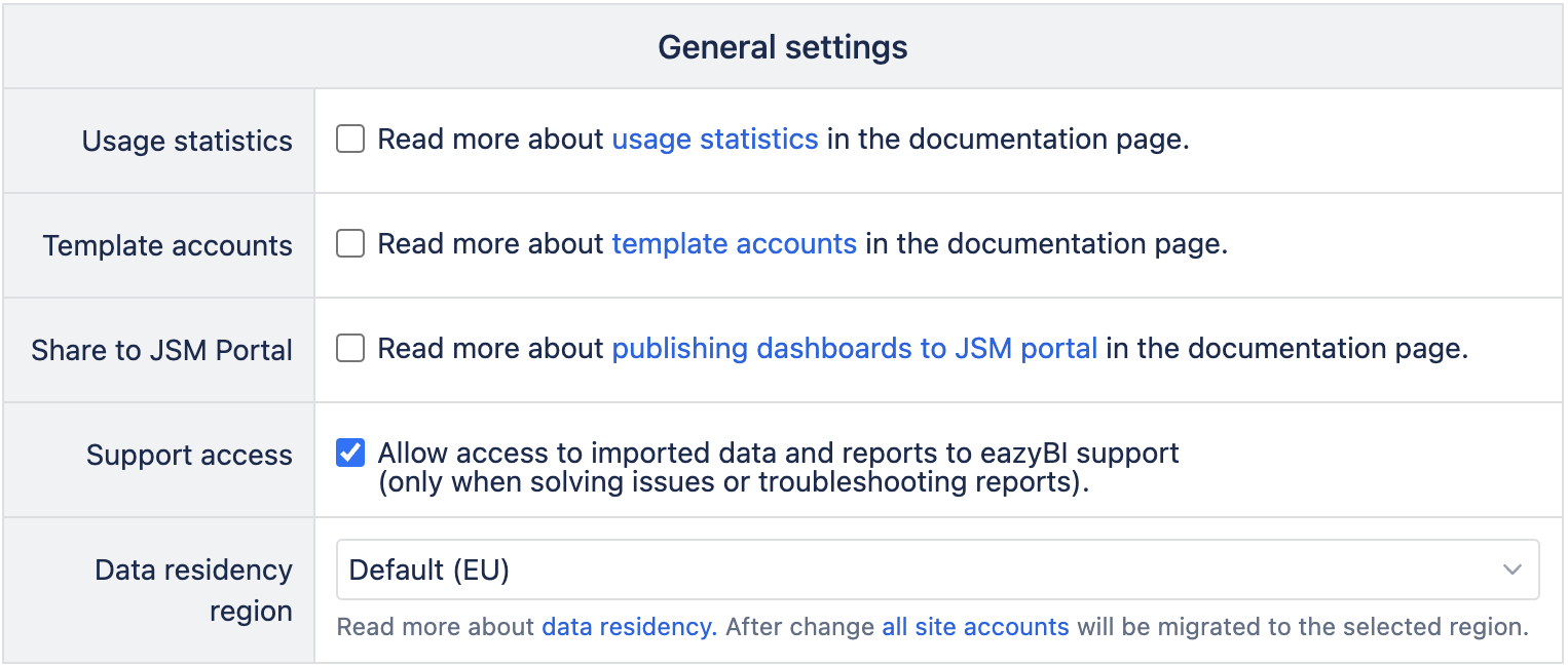 After the change, background jobs will be started that will migrate all imported data in all site accounts to the new data residency region. All eazyBI reports will be available during the data migration. After the migration eazyBI will automatically switch over to the new data residency region.